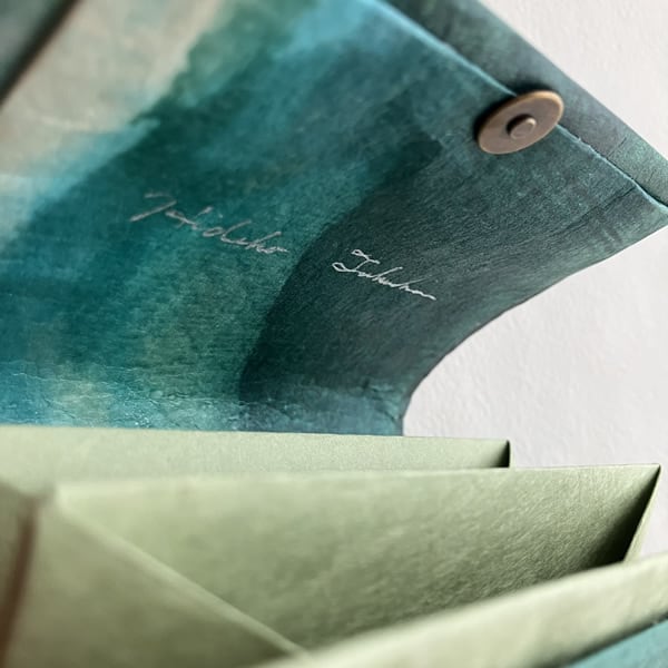 緑のグラデーションの色が紙面に広がる名刺入れです。森林と名前をつけました。和紙色はあたたかみのある白色です。その白が紙面に残ることで、より自然の風景に近くなるような気がします。ふたの内側の水色と緑が重なり合う色合いが美しいです。