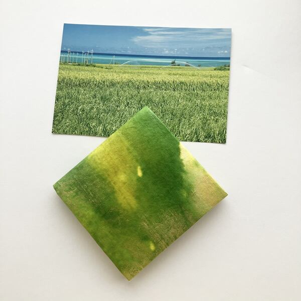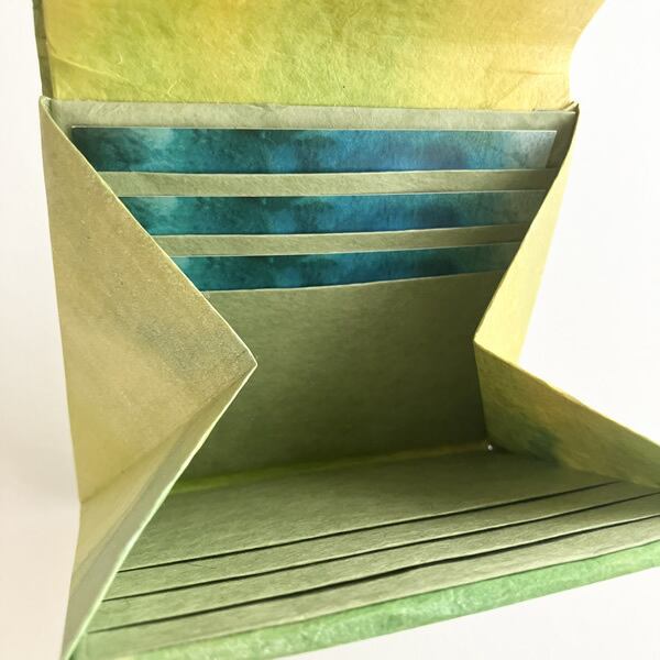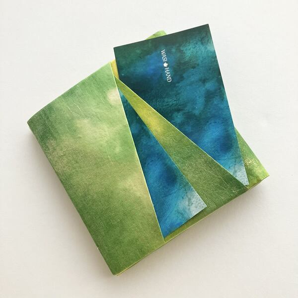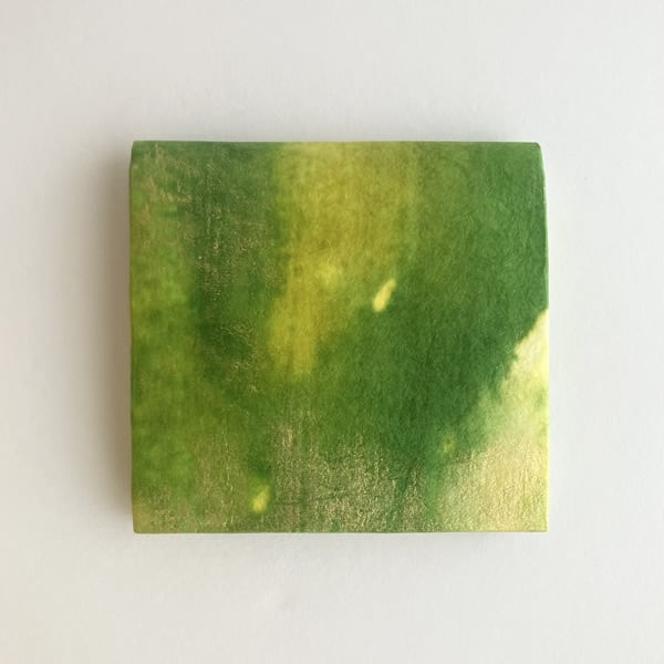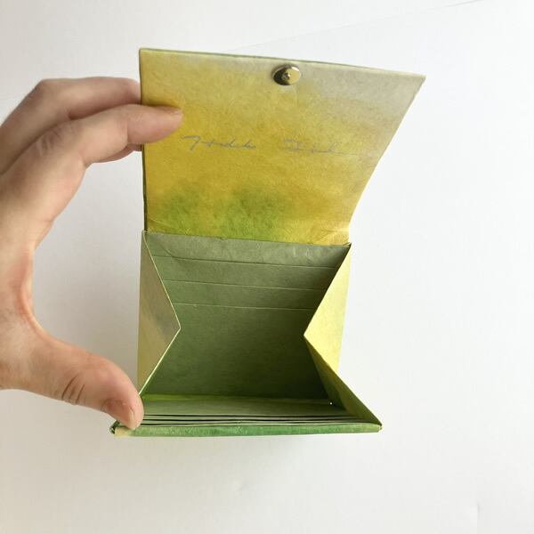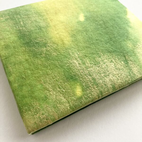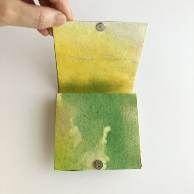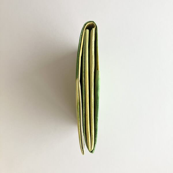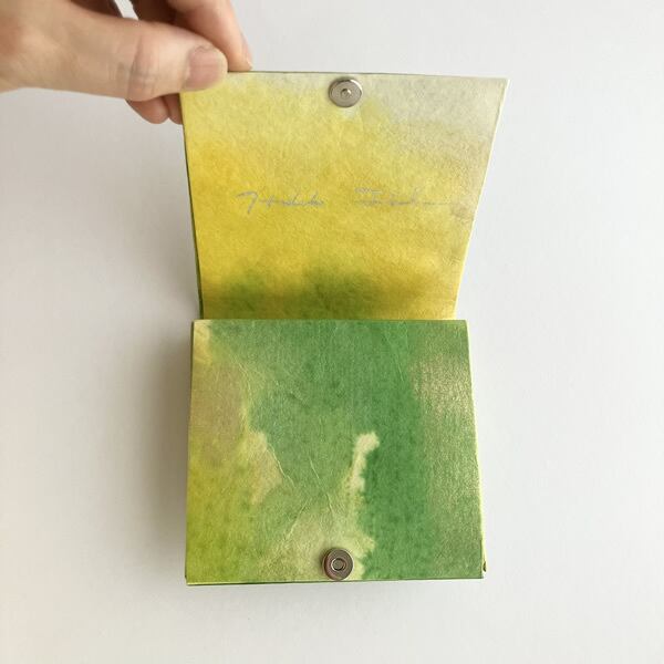 新緑に染めた和紙を折財布に仕上げました。自然素材の和紙を使うことで、和紙の質感が手元に感じられます。生成り色の和紙を黄色、黄緑色、金色と。新緑で感じられる色合いを重ねるように染めていくことで、和紙に光を浴びた新緑のみずみずしさが感じられるような色合いに仕上がりました。使用したのは京都府綾部市の黒谷和紙、楮(こうぞ)紙です。「こんにゃくのり」という昔から和紙を補強するのに使用されていた自然素材でコーティングしながら色染めを繰り返し、途中揉みも加えることでさらに丈夫な和紙になりました。この手漉き和紙をお財布の外側部分に使用しています。