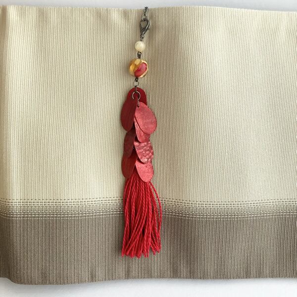 紅と名付けたこの根付はコクのある赤色で仕上げました。しっかりと色づいた赤色はとても上品で魅力的です。同じ赤色の綿糸にコーティングをかけて繊維質を整えタッセルに仕上げました。ヴェネチアビーズの赤色を加えて、全体を赤でまとめたコーディネートは赤色の強さ、美しさを感じます。赤く染めた和紙は花びらのかたちにカットしています。使用したのは京都府綾部市の黒谷和紙。昔からの工法を守り、現代に受け継ぐ黒谷和紙共同組合。職人さんが漉く和紙は自然そのままです。帯に挟む部分は差し込んだ時に体に負担の無いように和紙を貼り重ねています。撥水効果のあるパールトーン加工を全体に施しています。※パールトーン加工は洗剤等で加工がとれてしまう場合があります。ご使用の際は洗剤等での洗浄は御控え下さい。