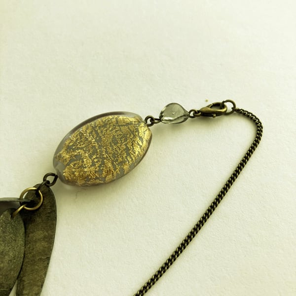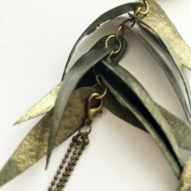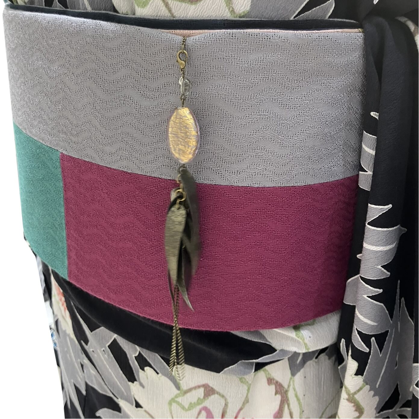 鷲と名付けたこの根付は大振りのヴェネチアビーズが印象的です。黒に金色で彩られた和紙が落ち着いた中にも華やかさがあり、とても上品です。シックな装いに調和してくれると思います。スモーキーグレーと金彩のヴェネチアビーズに魅せられて、色染めされた和紙を選び、組み立てていきました。どんなお着物にコーディネートしてもらえるか楽しみです。使用したのは京都府綾部市の黒谷和紙。昔からの工法を守り、現代に受け継ぐ黒谷和紙共同組合。職人さんが漉く和紙は自然そのままです。帯に挟む部分は差し込んだ時に体に負担の無いように和紙を貼り重ねています。撥水効果のあるパールトーン加工を全体に施しています。※パールトーン加工は洗剤等で加工がとれてしまう場合があります。ご使用の際は洗剤等での洗浄は御控え下さい。