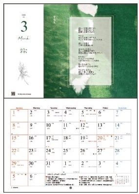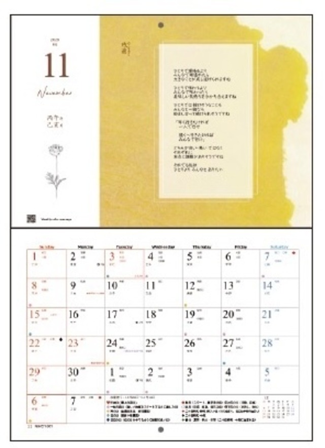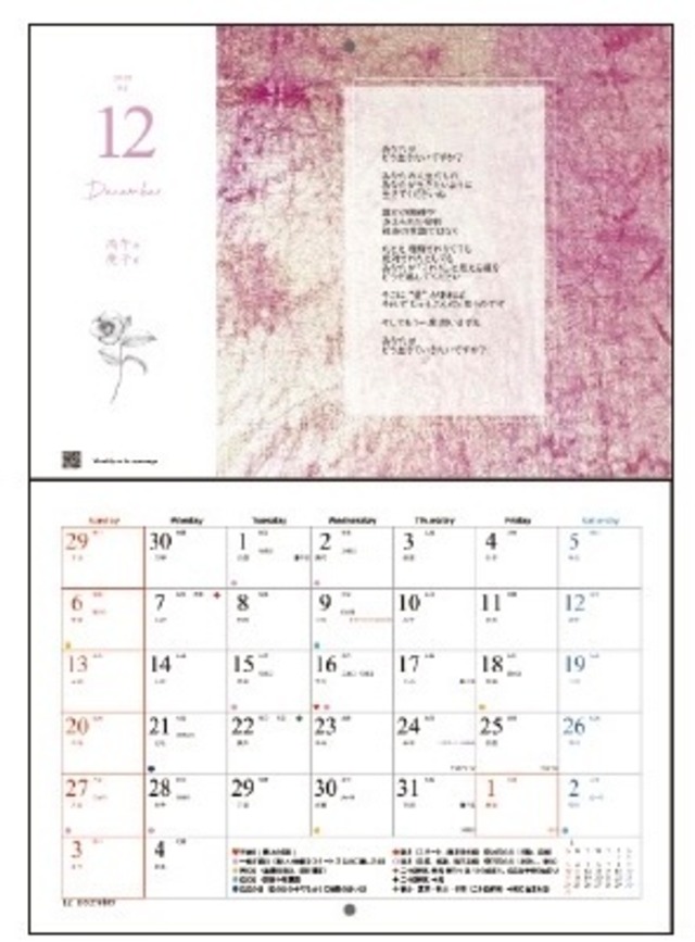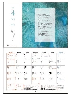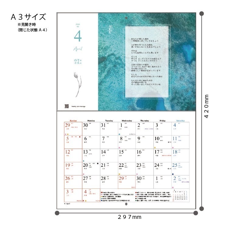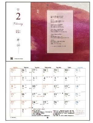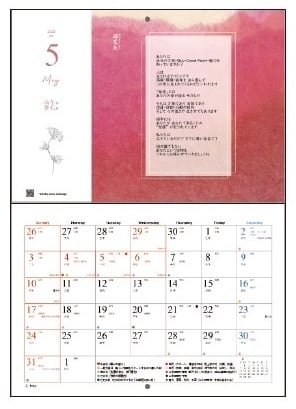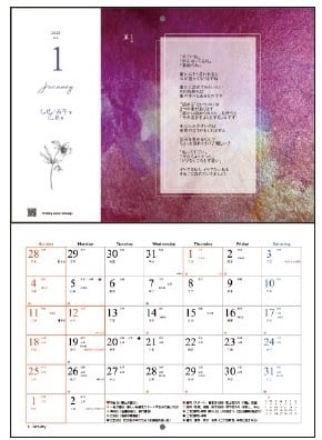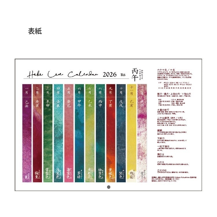 毎日をハッピーに過ごして頂きたいと制作されたカラーコラム付きカレンダーです。背景に色染め和紙を使用頂きました。カラーコンサルタントの岡村知美さんのカラーコラム付きです。一粒万倍日や天赦日などの吉日や新月満月の情報などが 記載されていて、心温まるコラムは日々の暮らしに潤いを与えてくれるよう。カレンダーと共に大切に過ごして頂ければ幸いです。