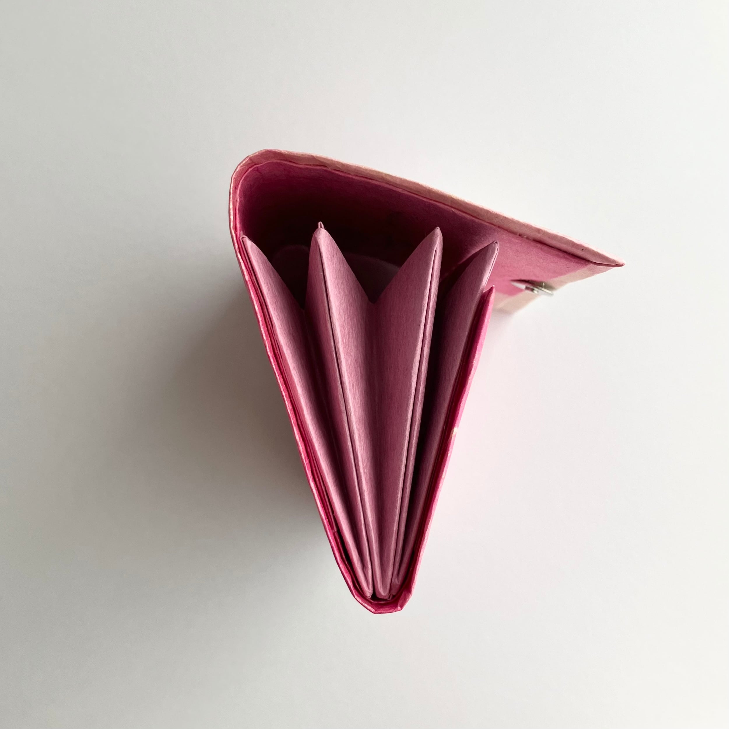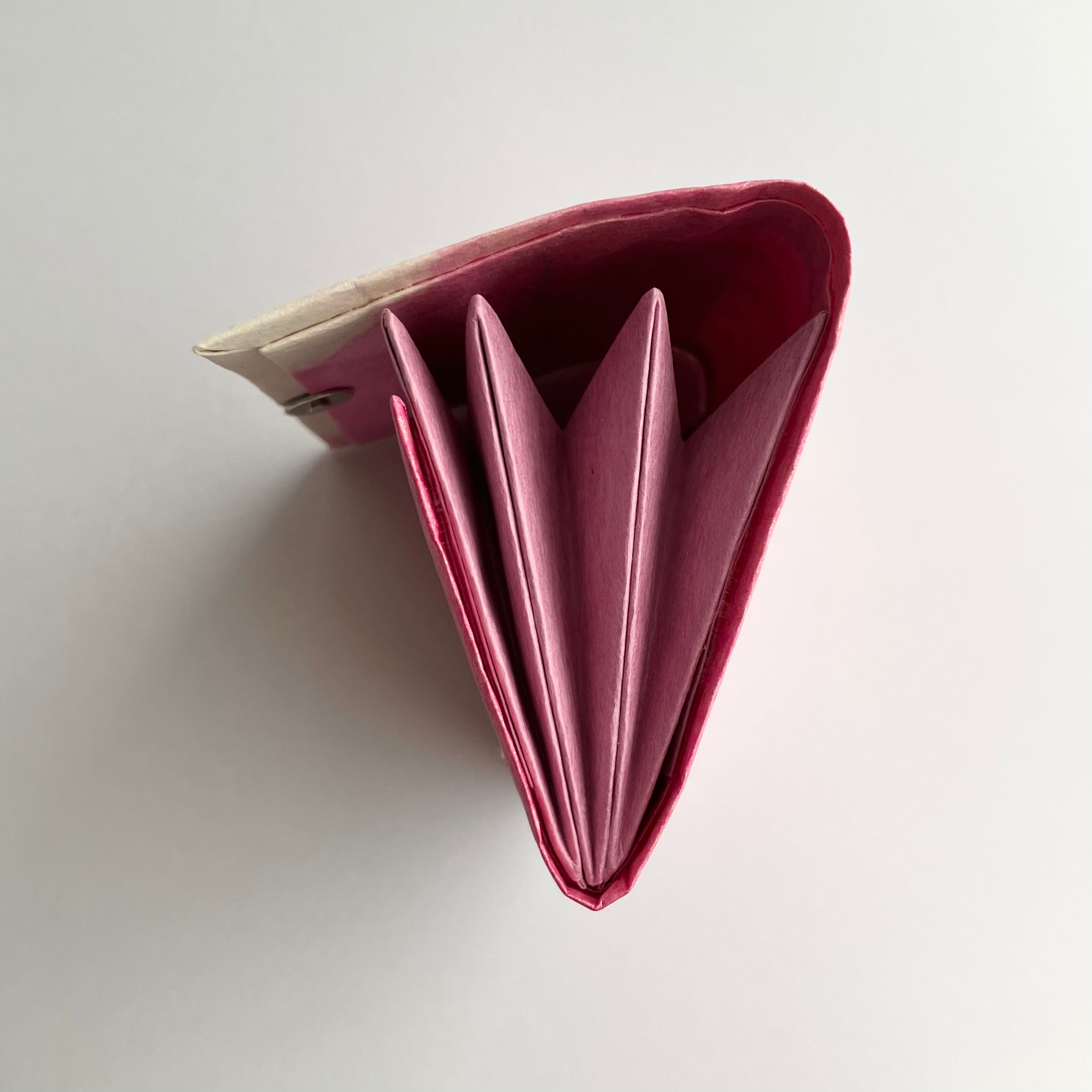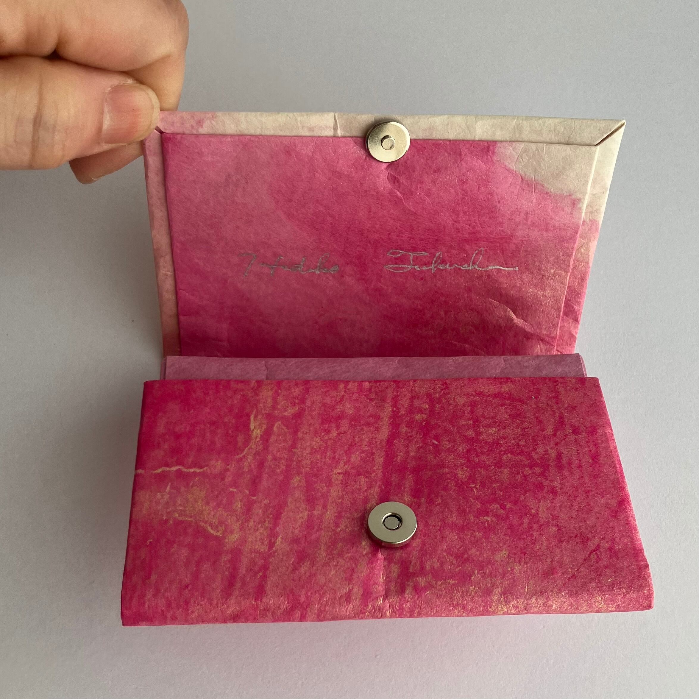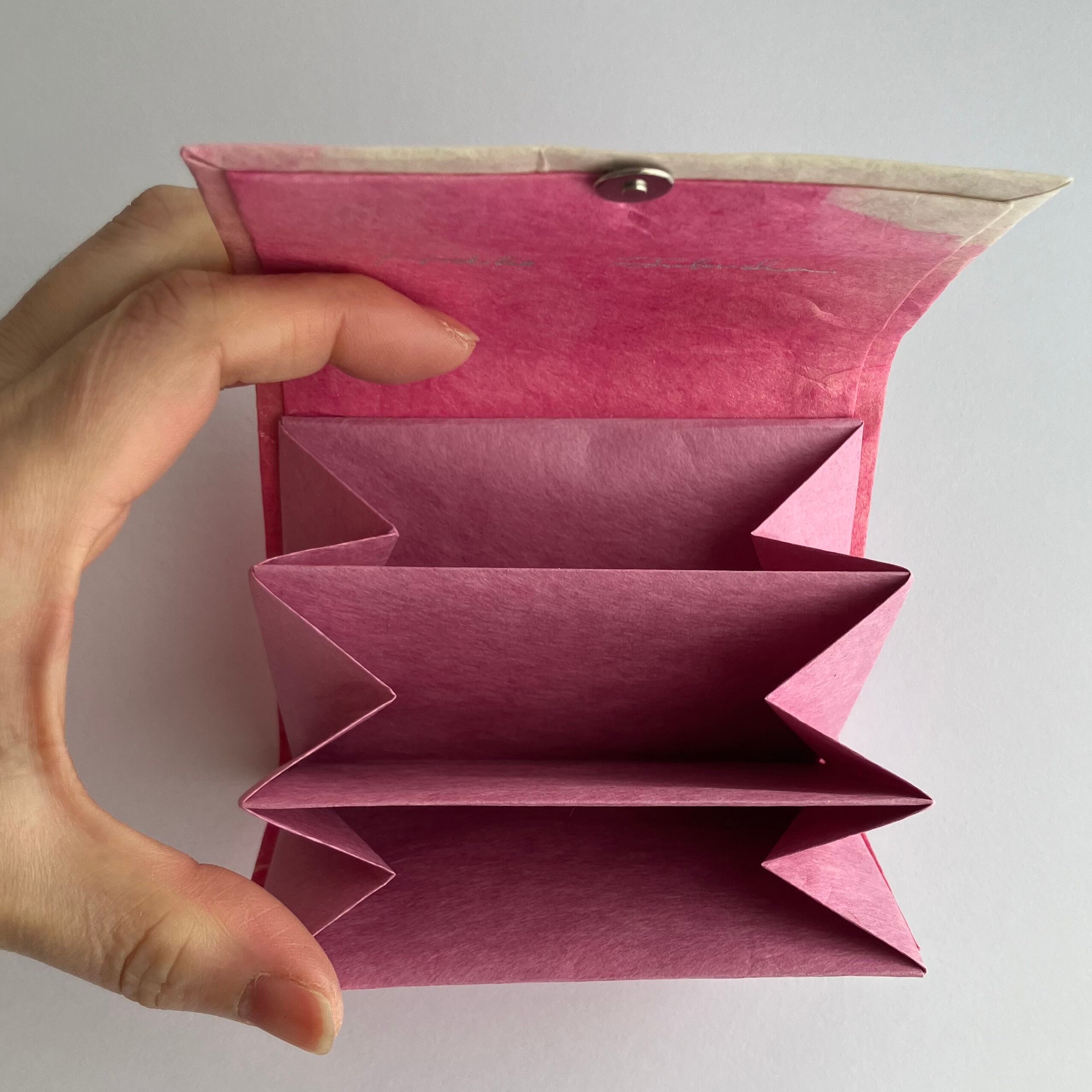 3つポケット。マグネットボタン <サイズ> 約 高さ7.5cm×幅10.5cm×厚み1.5cm <重さ>18g ポケットに使用した同じ色の三椏紙の和紙袋、「作品のお取り扱いについて」説明書付き