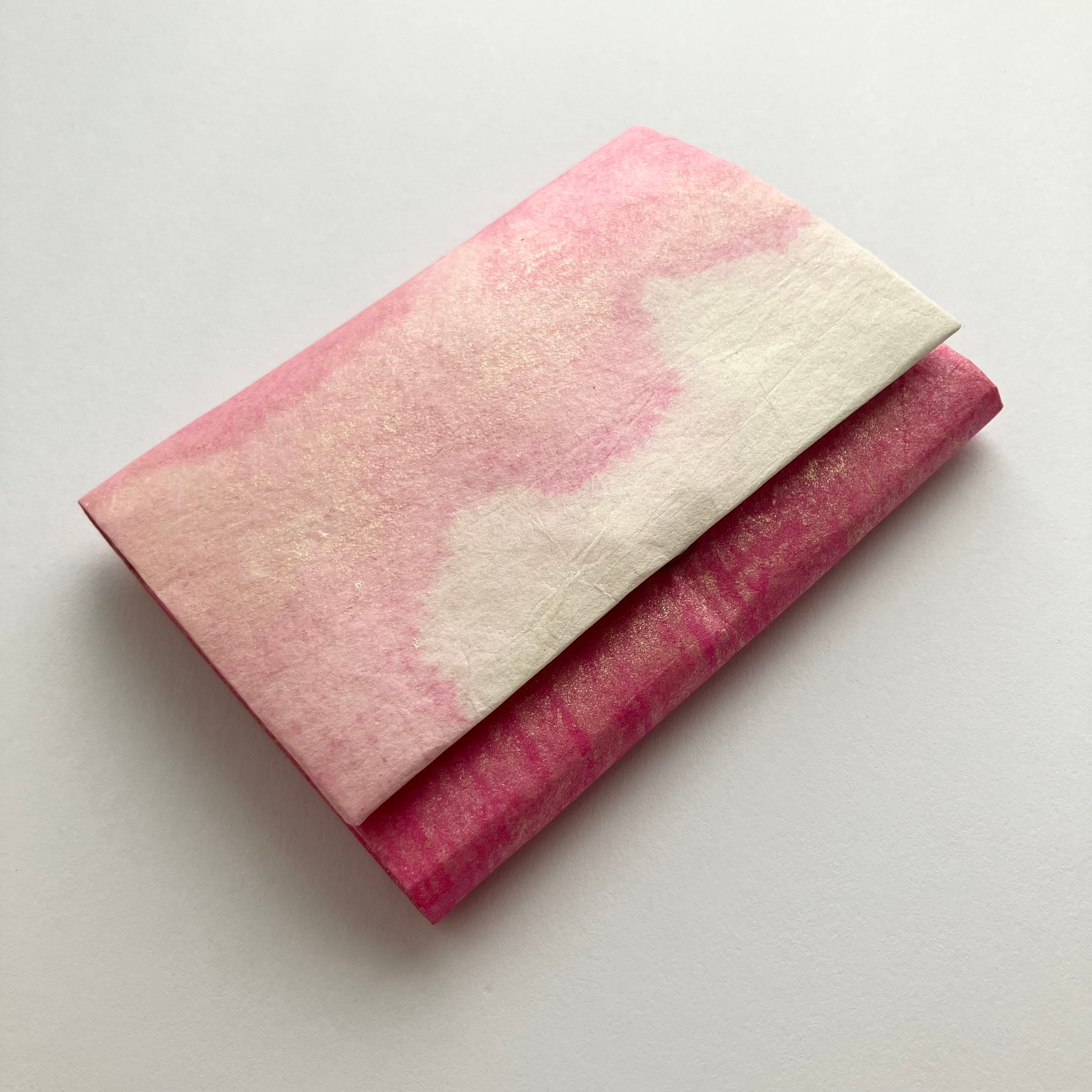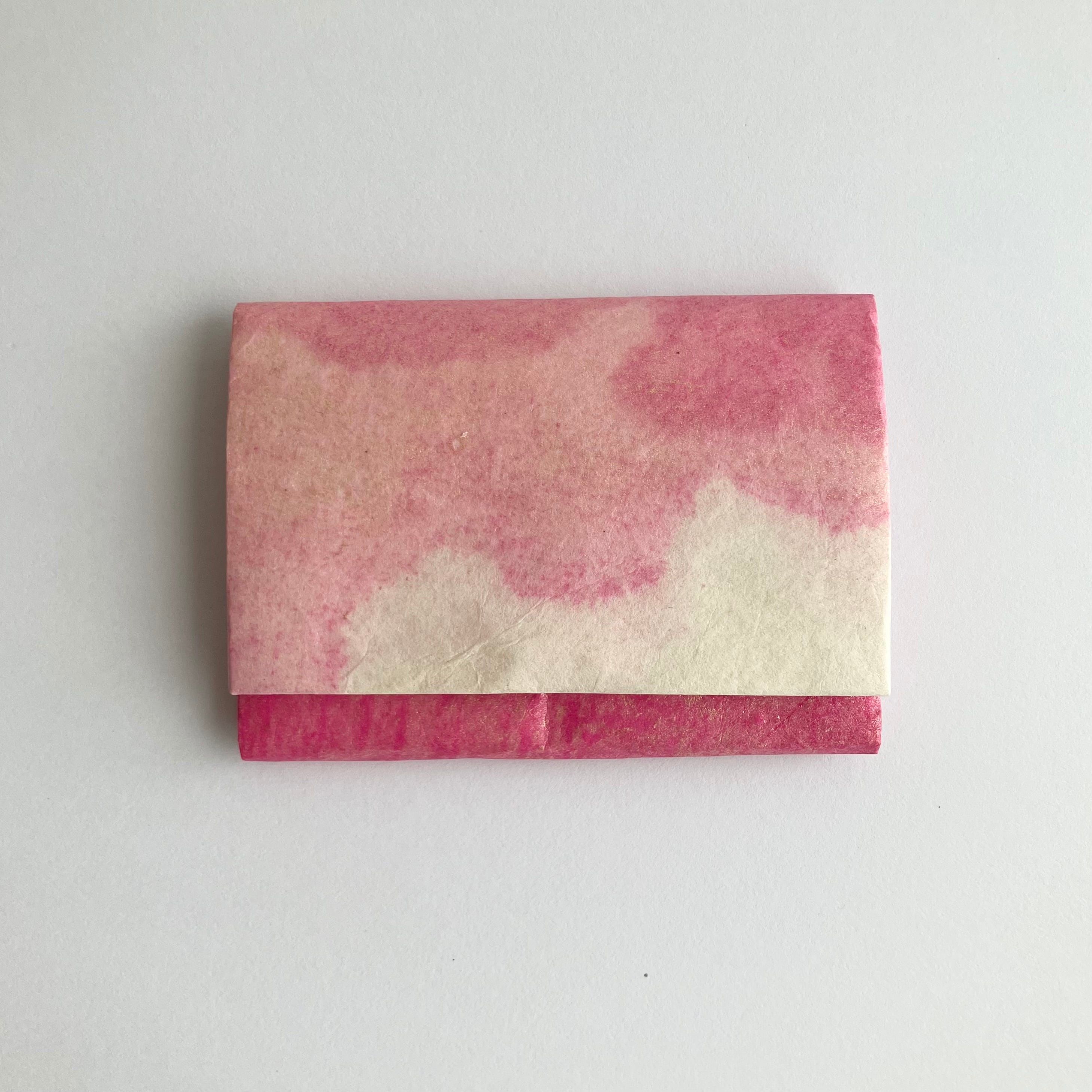 桃色と名前をつけたこの名刺入れは黄色、桃色をベースにパール色を加えて華やかに仕上げました。トロピカルな色合いの名刺入れです。ふたを開けた時にも絵のような表情になるように和紙を貼り合せて仕上げました。優しい色合いで明るい印象の名刺入れです。