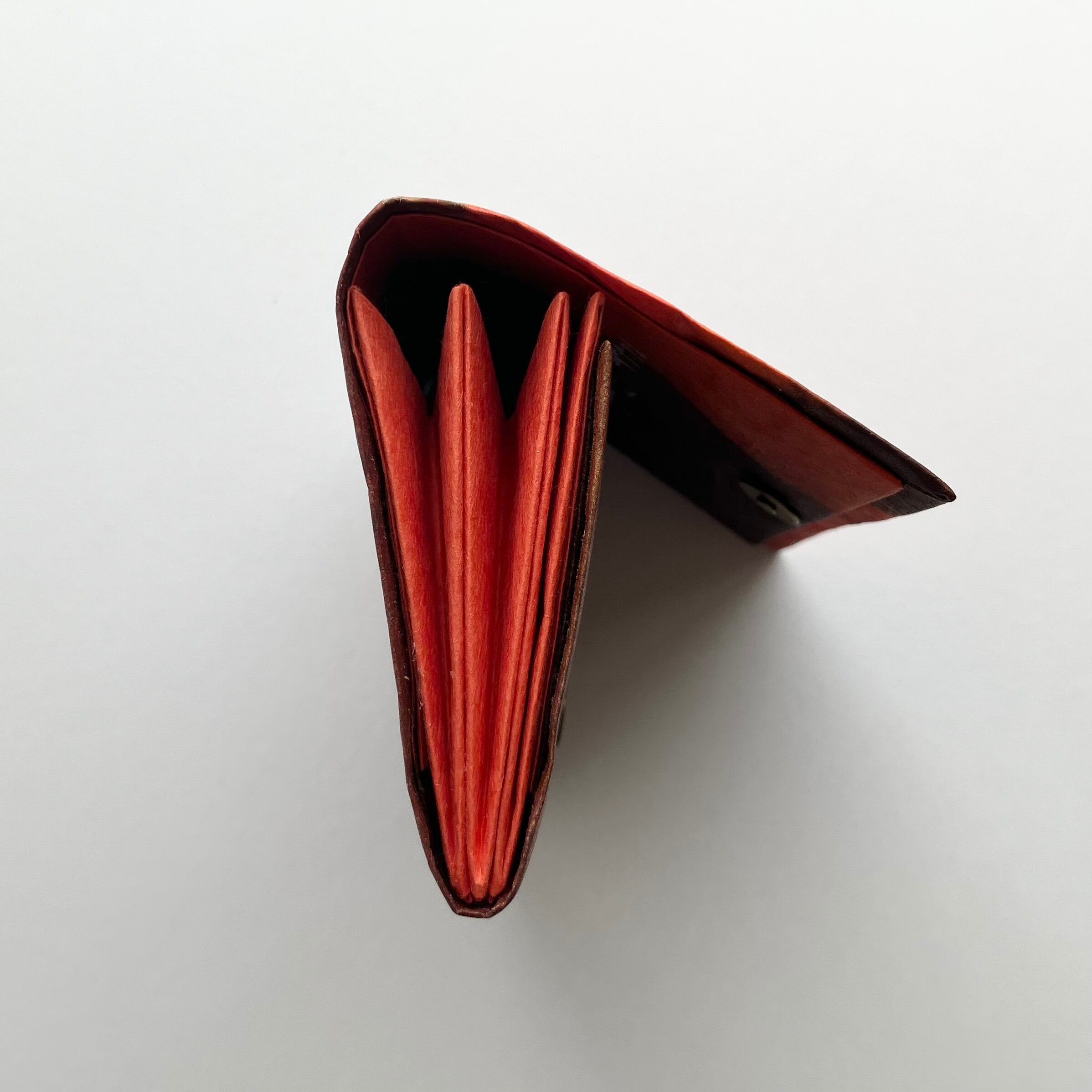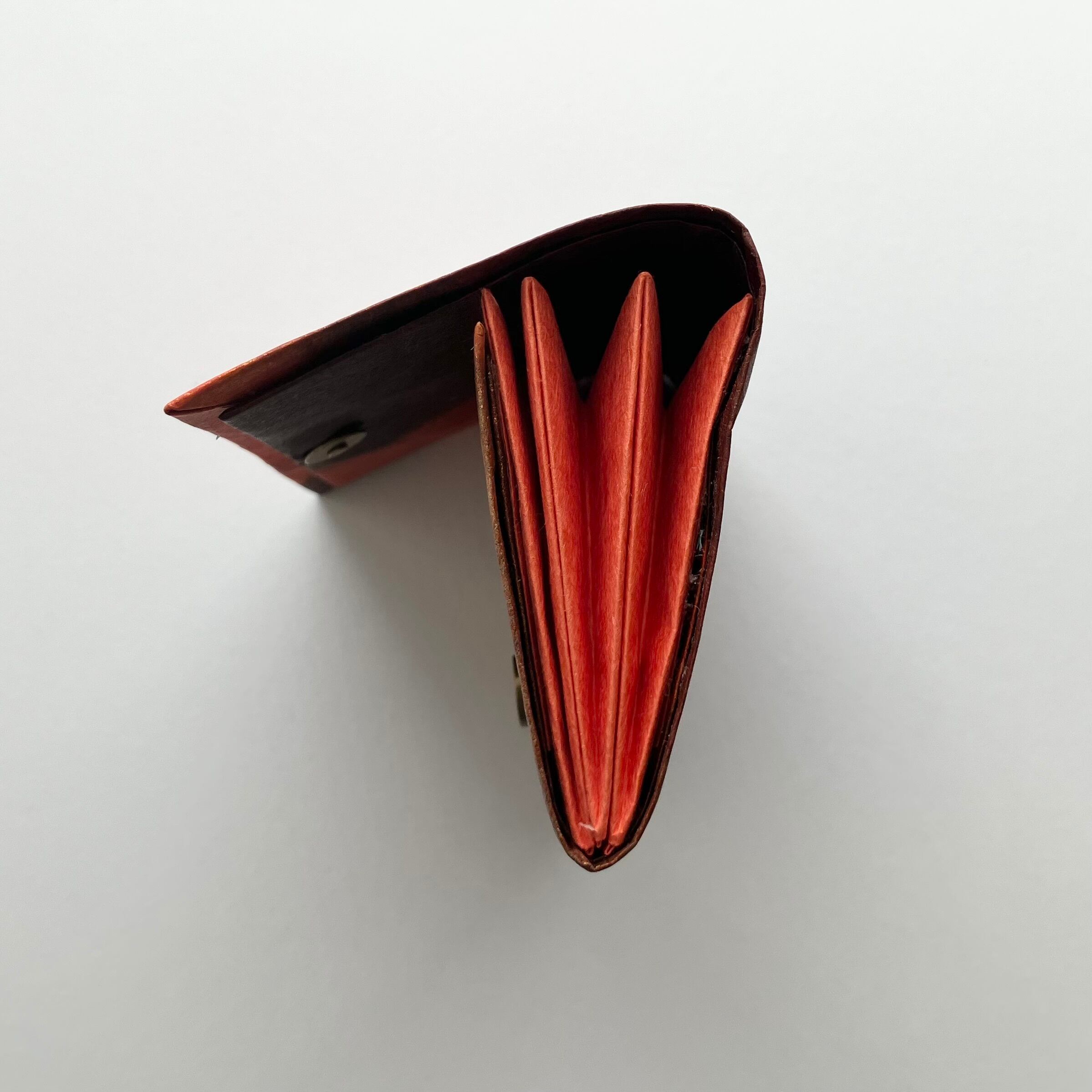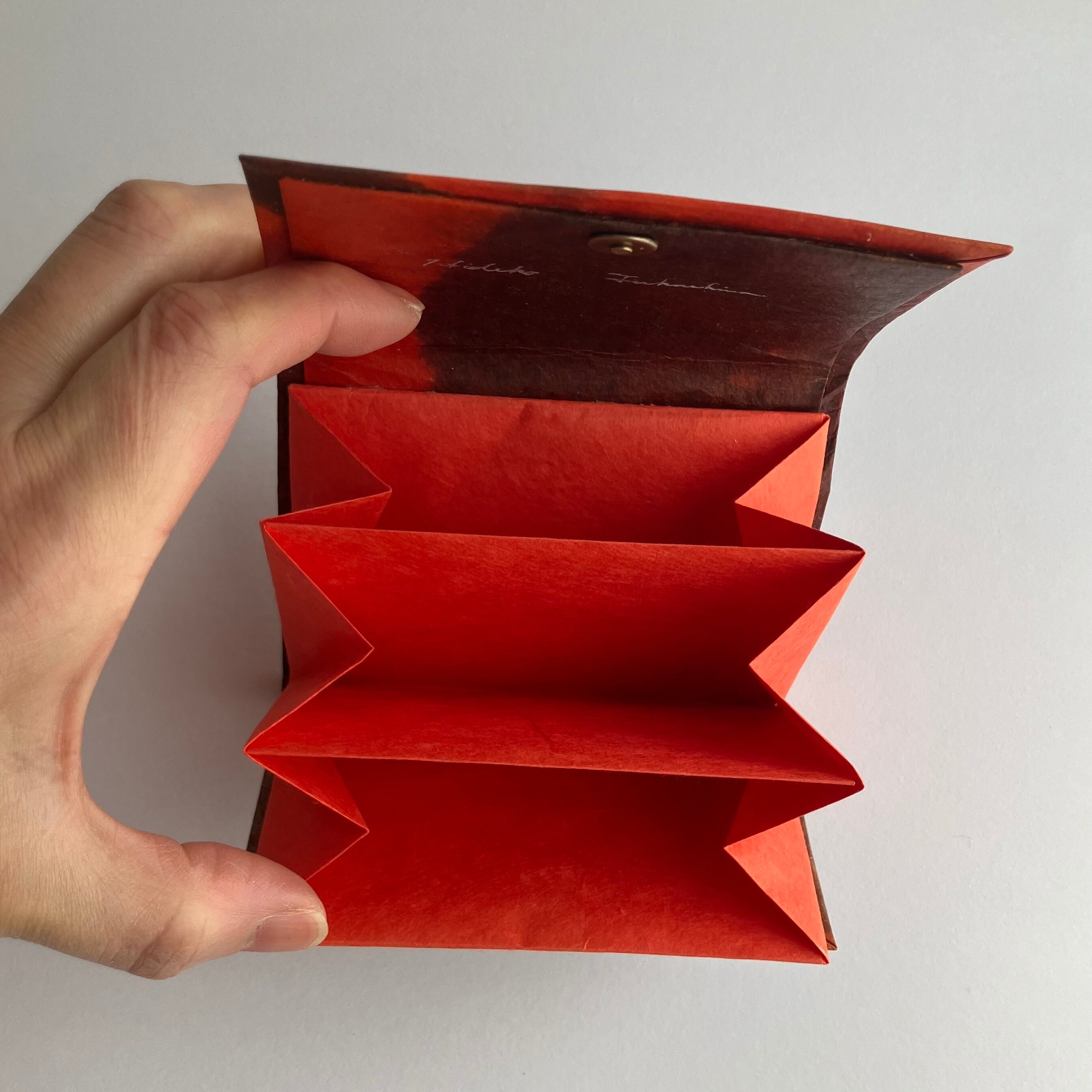 3つポケット。マグネットボタン <サイズ> 約 高さ7.5cm×幅10.5cm×厚み1.5cm <重さ>19g ポケットに使用した同じ色の三椏紙の和紙袋、「作品のお取り扱いについて」説明書付き