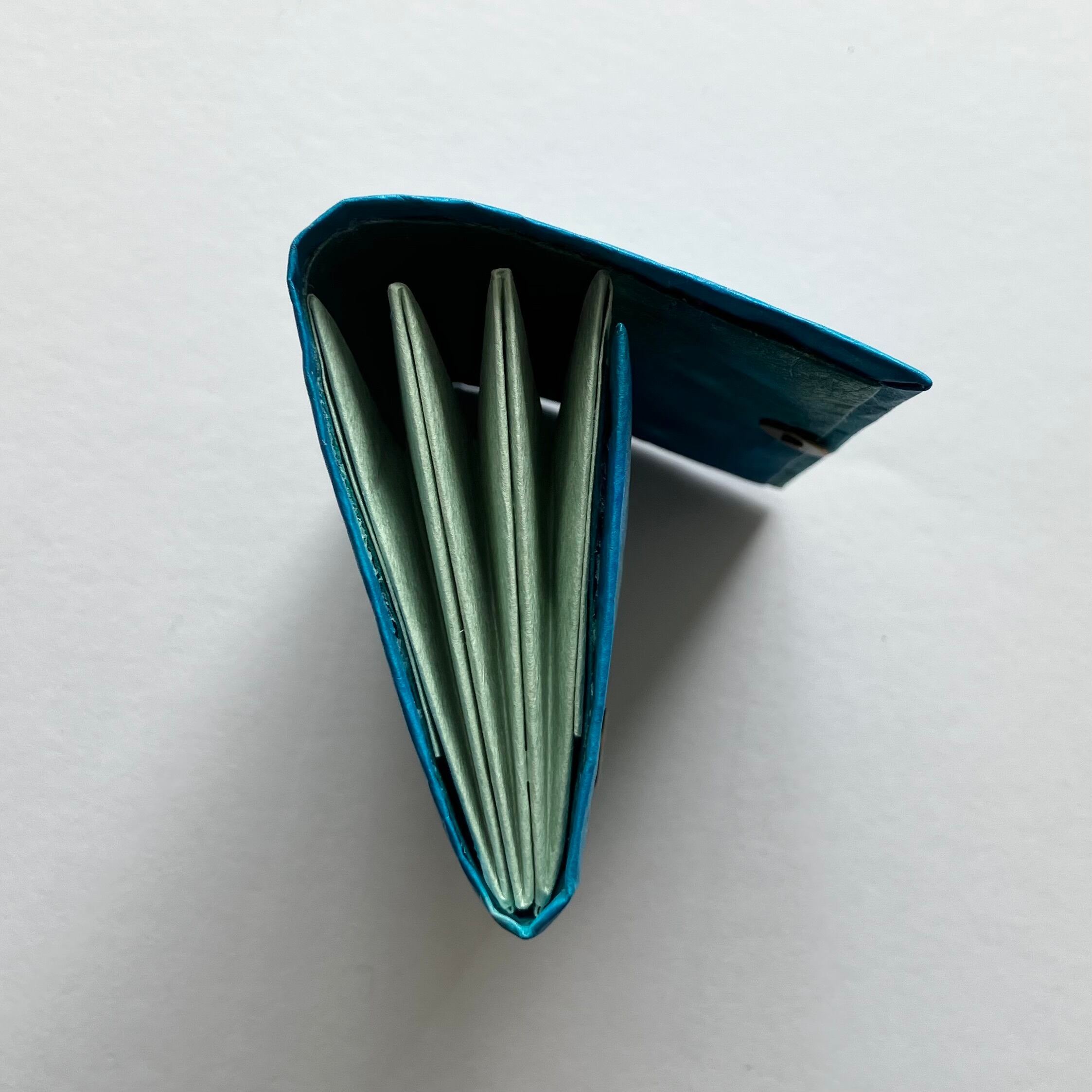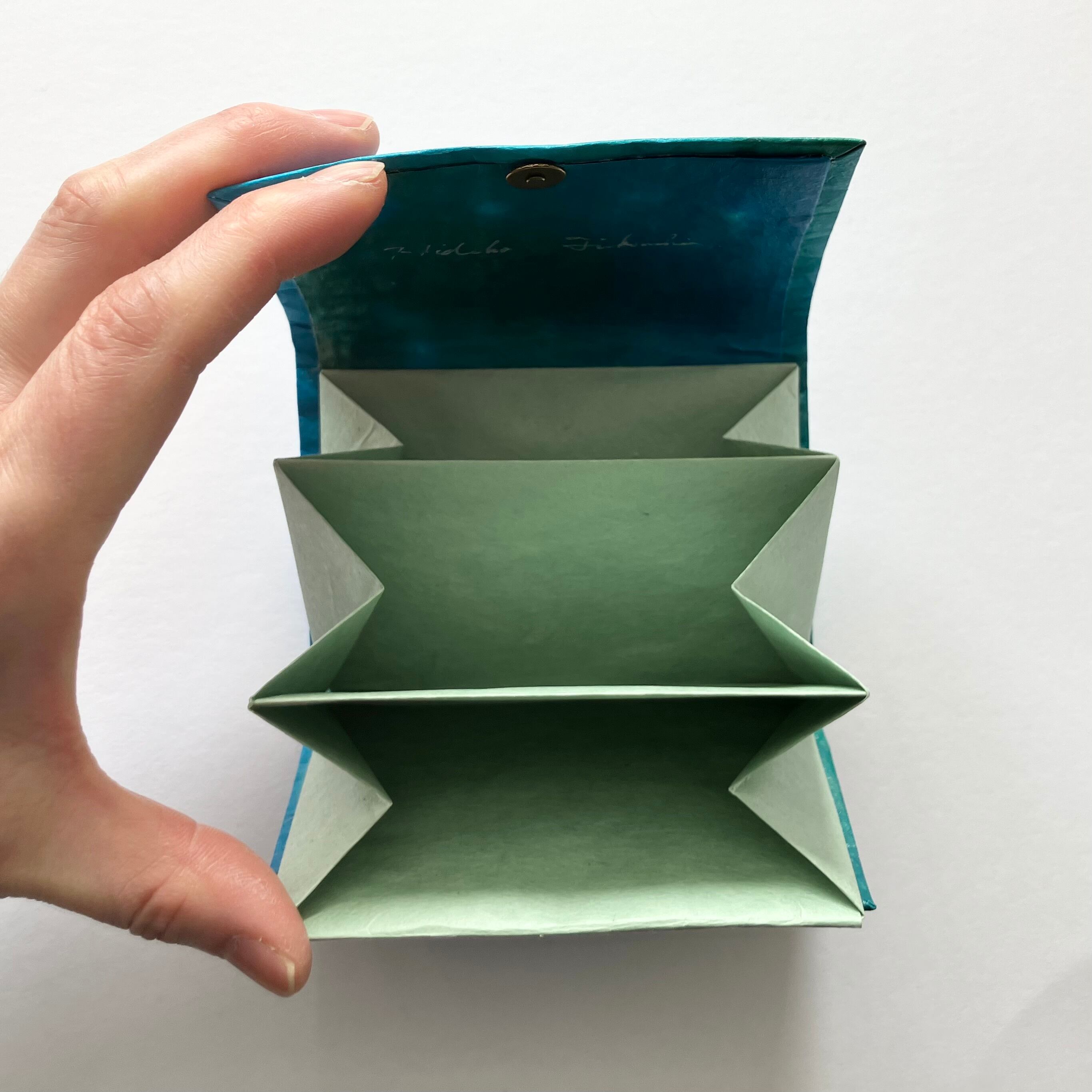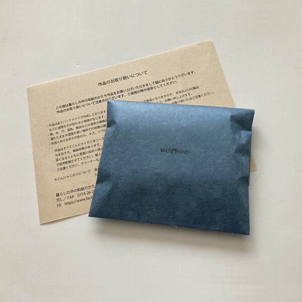 <サイズ> 約 高さ7.5cm×幅10.5cm×厚み1.5cm <重さ>19g ポケットに使用した同じ色の三椏紙の和紙袋、「作品のお取り扱いについて」説明書付き