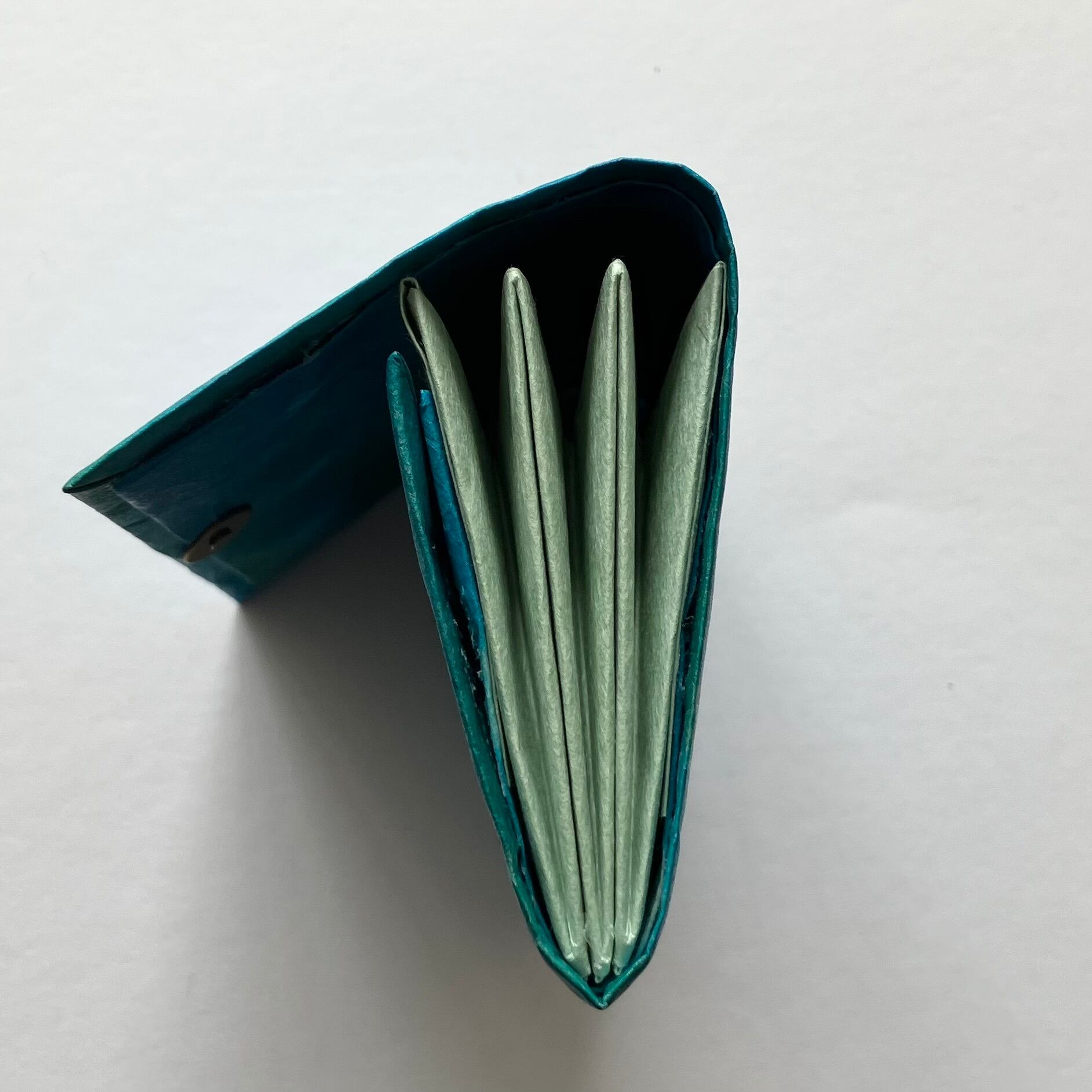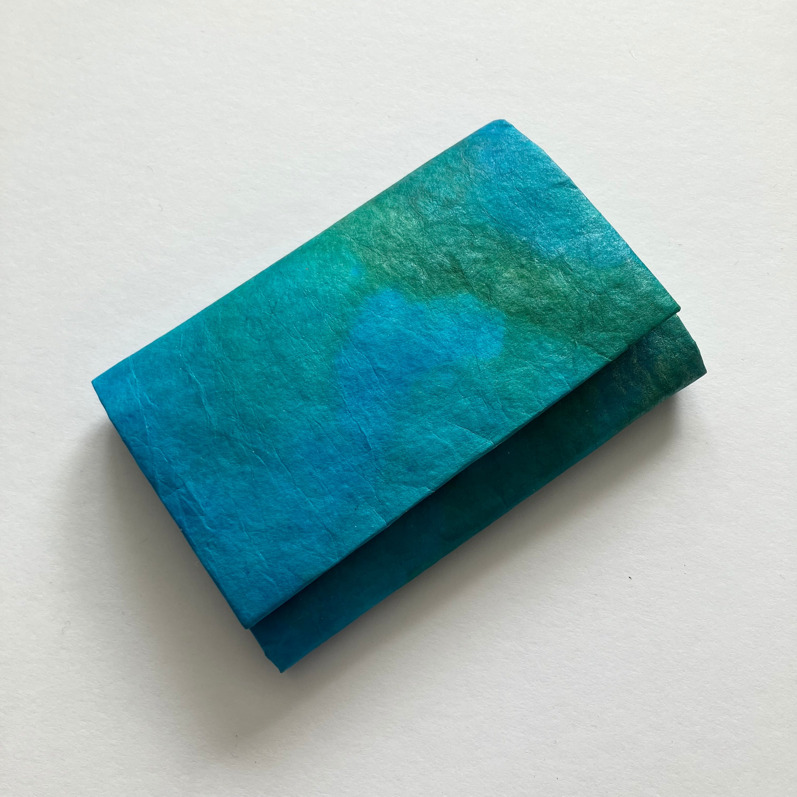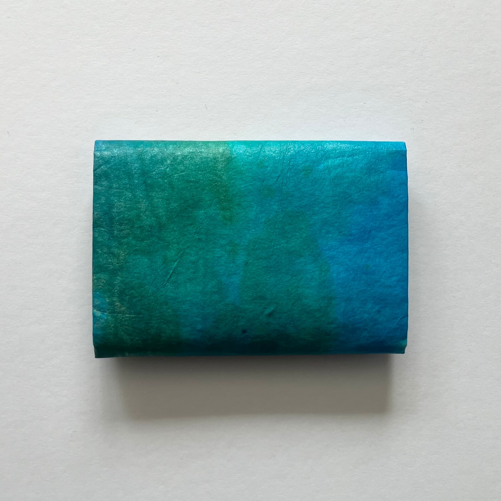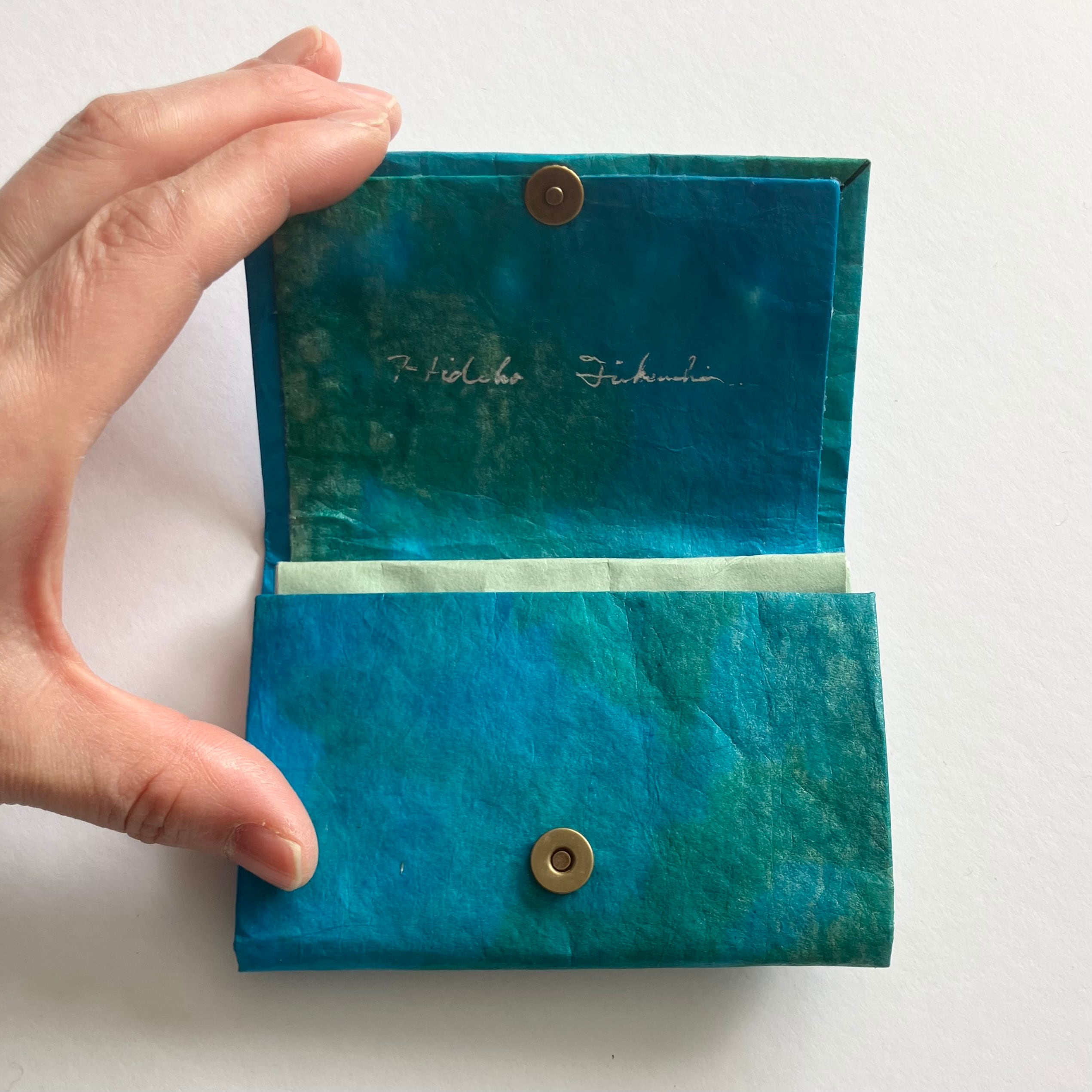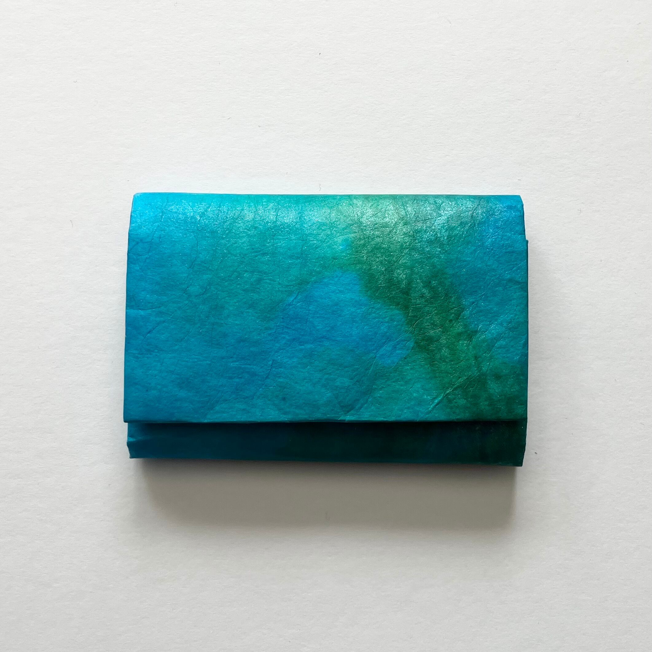 海色に染めて作った和紙の名刺入れです。沖縄の離島、宮古島の美しい海。眺めるだけで心地よい。そこに吹く風、太陽の光で照らされた海面は本当に美しくて癒されます。島で過ごした記憶をたどりながら染めた海色。日々の暮らしの中でこの名刺を使いながら、海を感じて頂ければ幸いです。