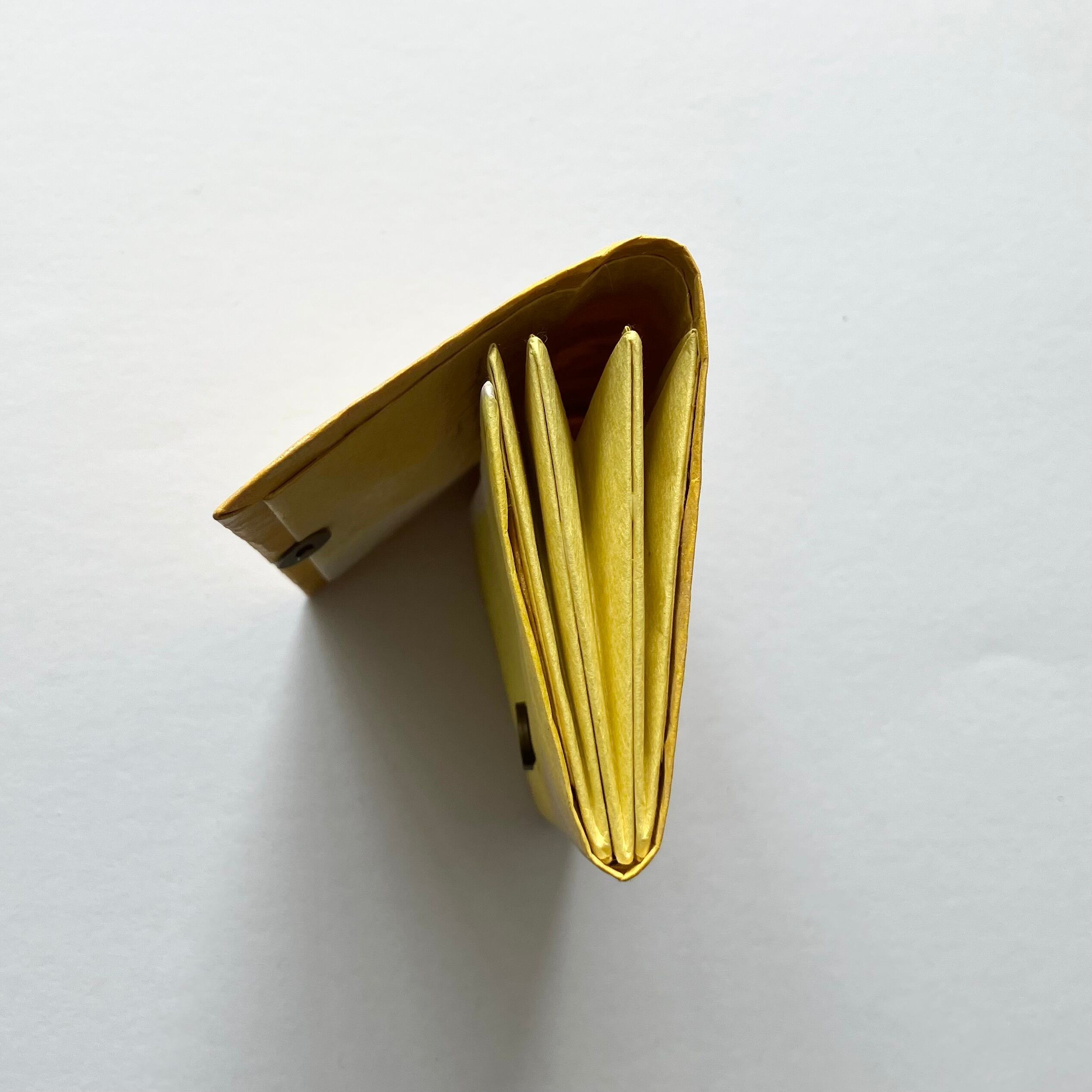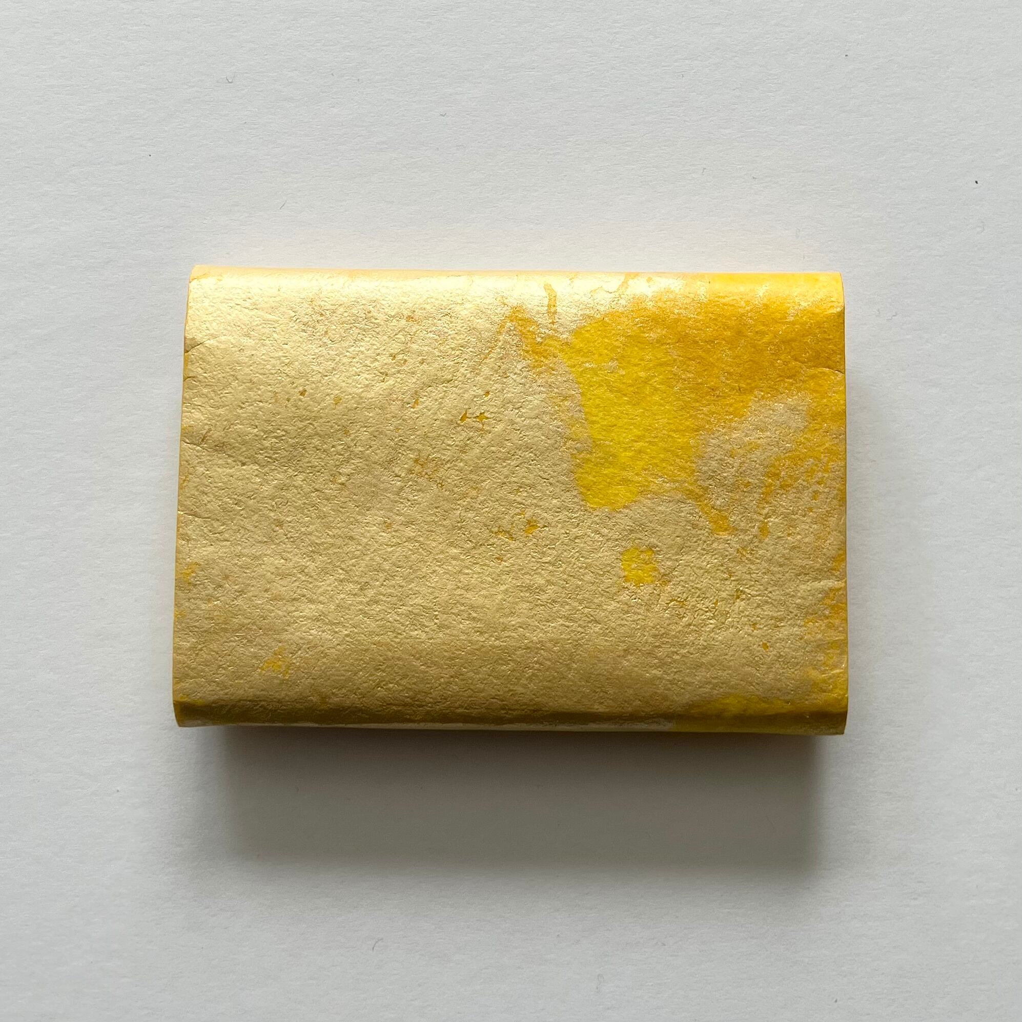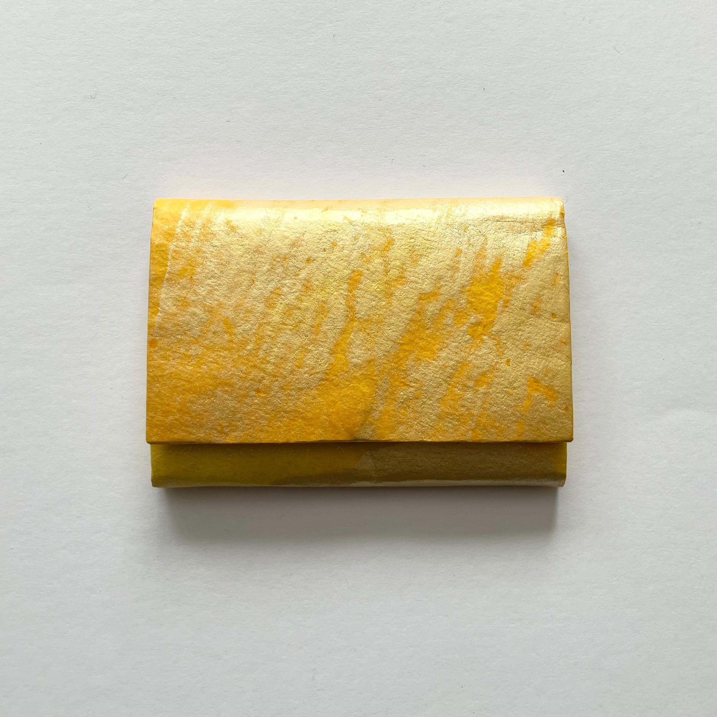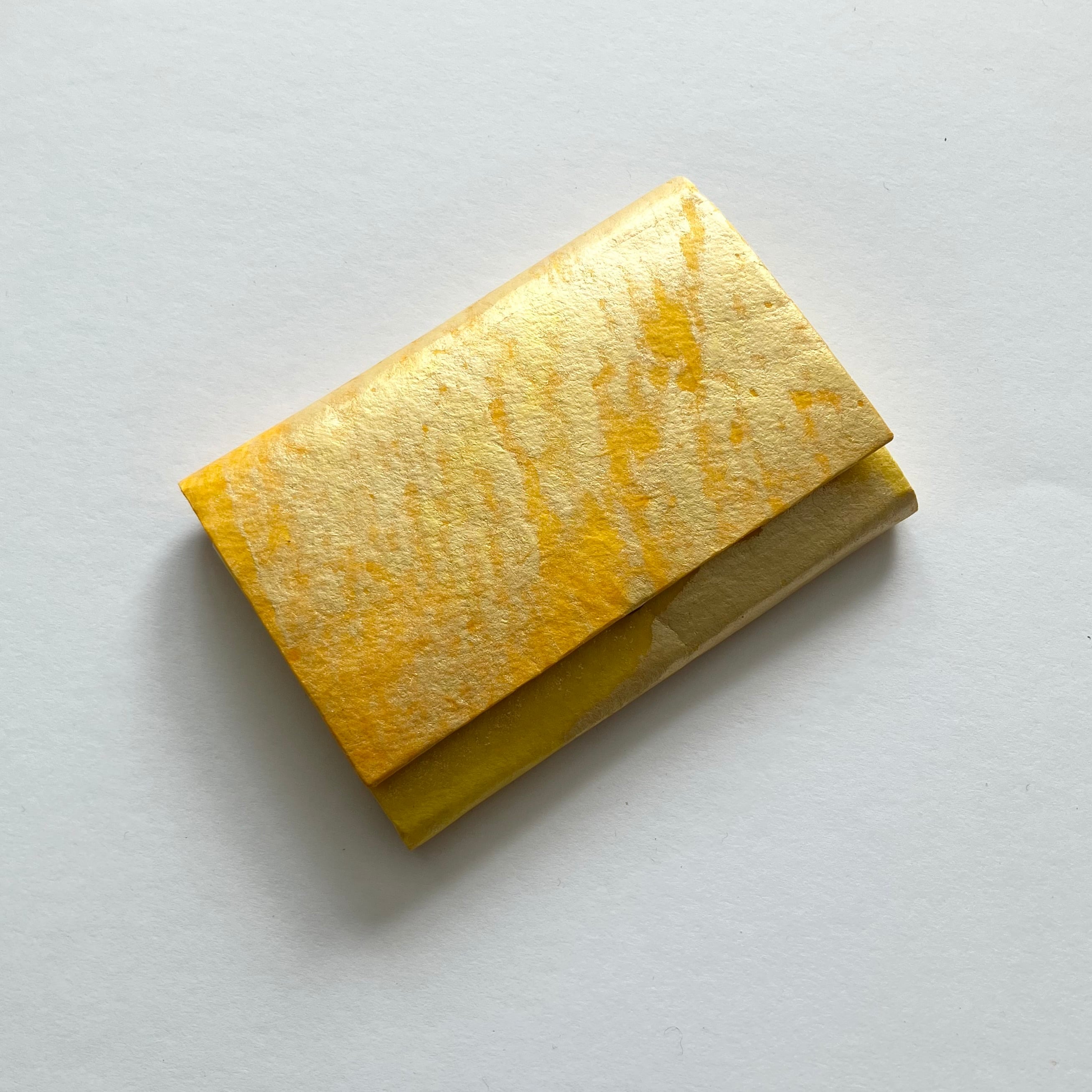 爽やかな檸檬色に染めた和紙で作った名刺入れです。黄色、金色、和紙色の調和が爽やかです。濃い黄色に金色がかかり、鮮やかで個性的ですが、爽やかな印象があります。ポケットは外側の印象に合わせて淡い黄色を合わせました。