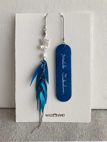 和紙で着物の根付を作りました。とても軽く、鳥の羽のようなパーツが揺れ動きます。使用したのは京都府綾部市の黒谷和紙。昔からの工法を守り、現代に受け継ぐ黒谷和紙共同組合。職人さんが漉く和紙は自然の美しさが手元から伝わります。丈夫な和紙を色染めして重ね貼りした後に、鳥の羽をイメージしながら1枚1枚を手でカットしました。乳白色の淡水パールを揺れ動くようにつなぎ合わせました。帯に挟む部分は差し込んだ時に体に負担の無いように和紙を貼り重ねています。撥水効果のあるパールトーン加工を全体に施しています。※パールトーン加工は洗剤等で加工がとれてしまう場合があります。ご使用の際は洗剤等での洗浄は御控え下さい。