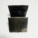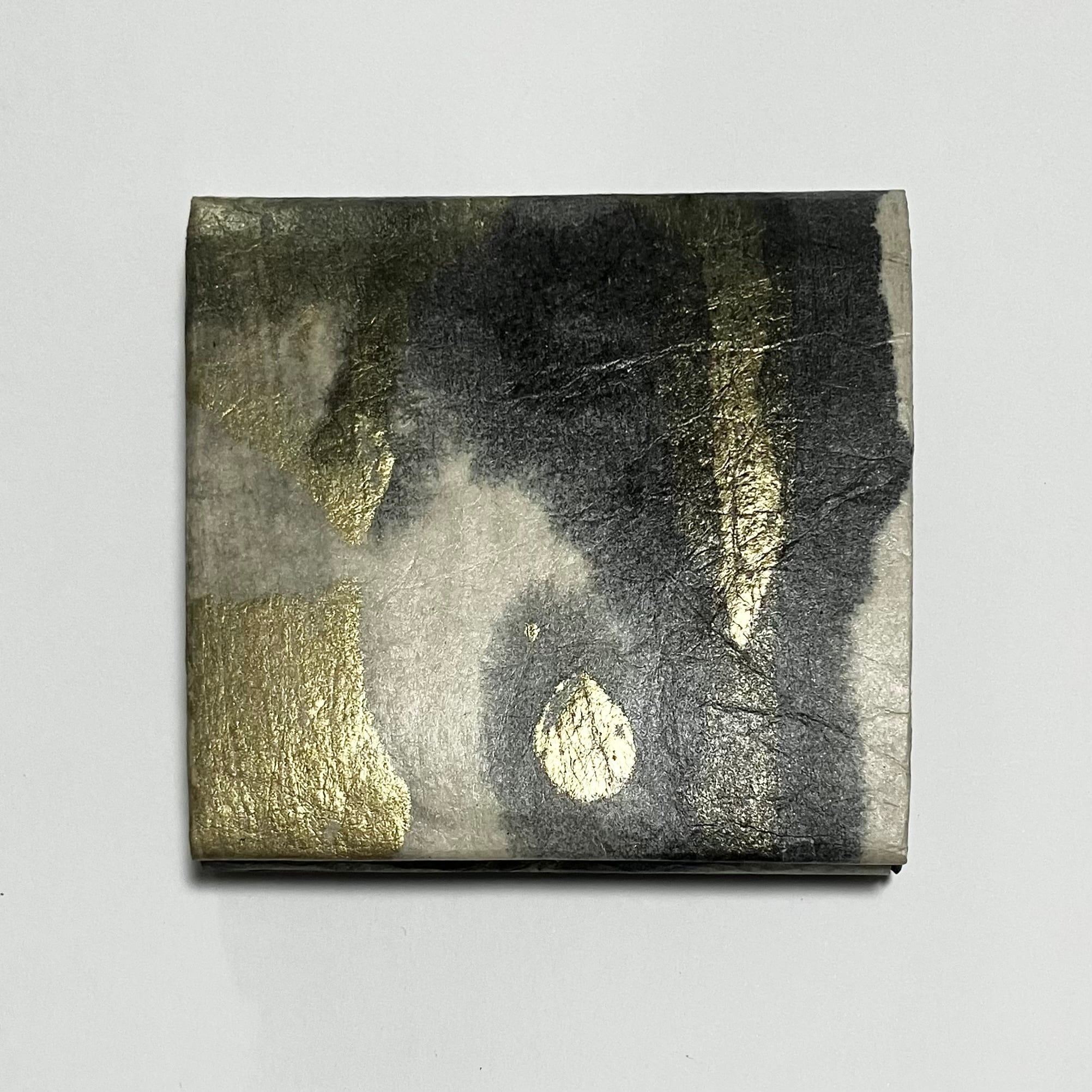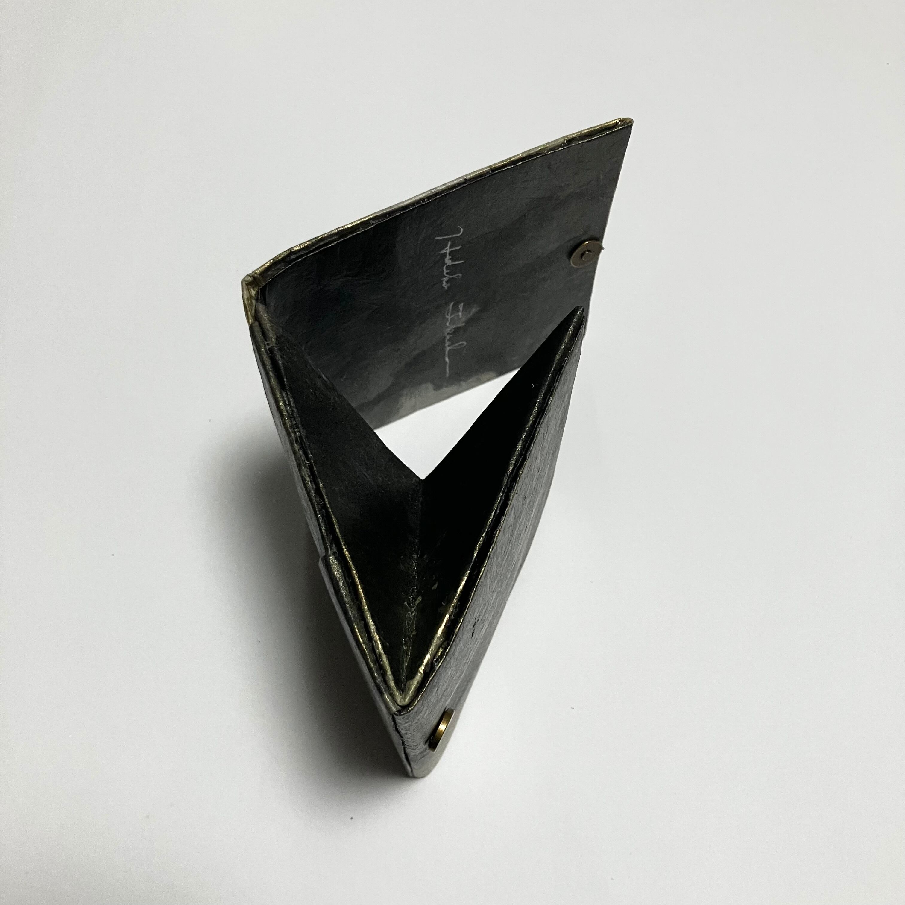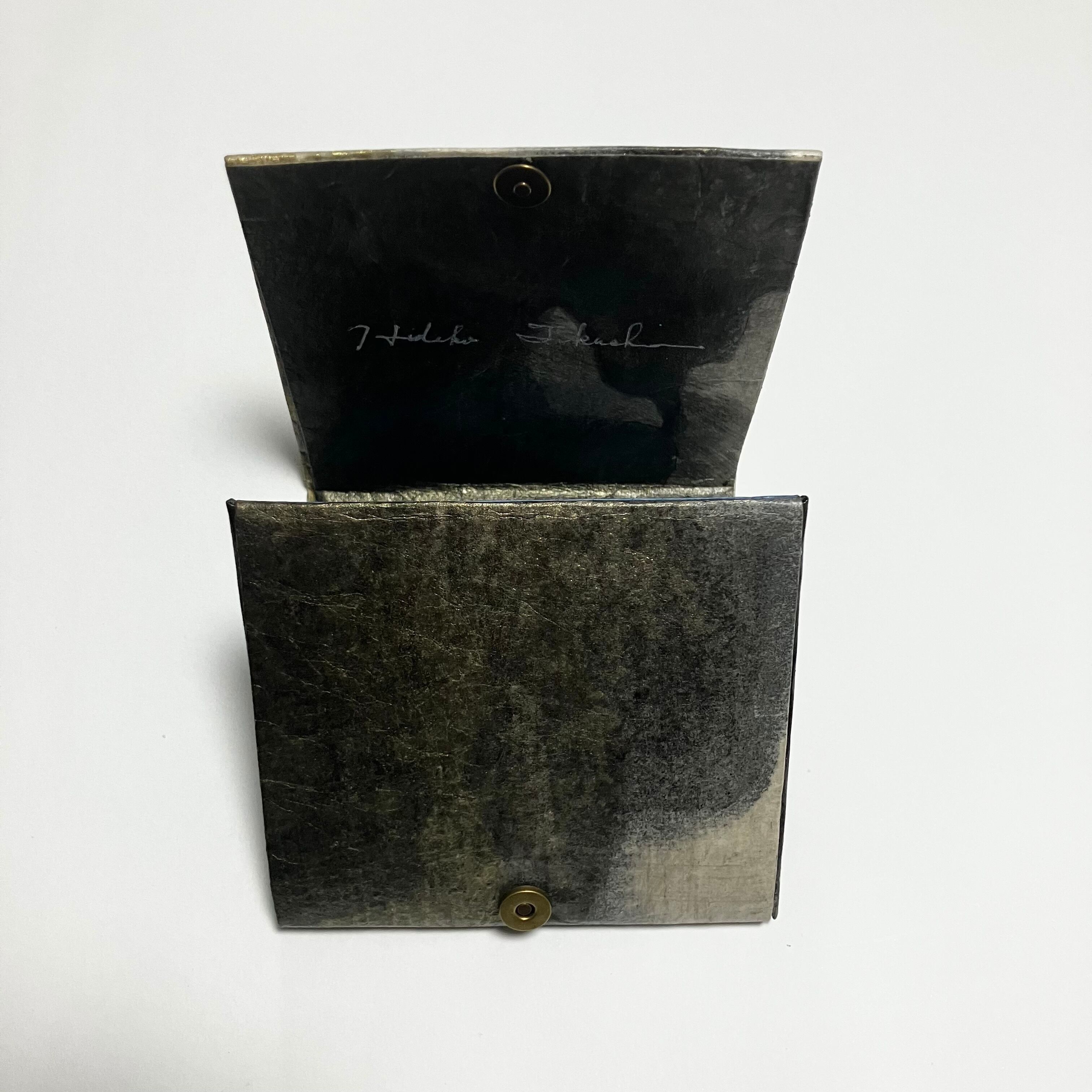 黒色、金色に染めた和紙を折財布に仕上げました。自然素材の和紙を使うことで、黒曜石のような表情に仕上がりました。使用したのは京都府綾部市の黒谷和紙、楮(こうぞ)紙です。「こんにゃくのり」という昔から和紙を補強するのに使用されていた自然素材でコーティングしながら色染めを繰り返し、途中揉みも加えることでさらに丈夫な和紙になりました。この手漉き和紙をお財布の外側部分に使用しています。