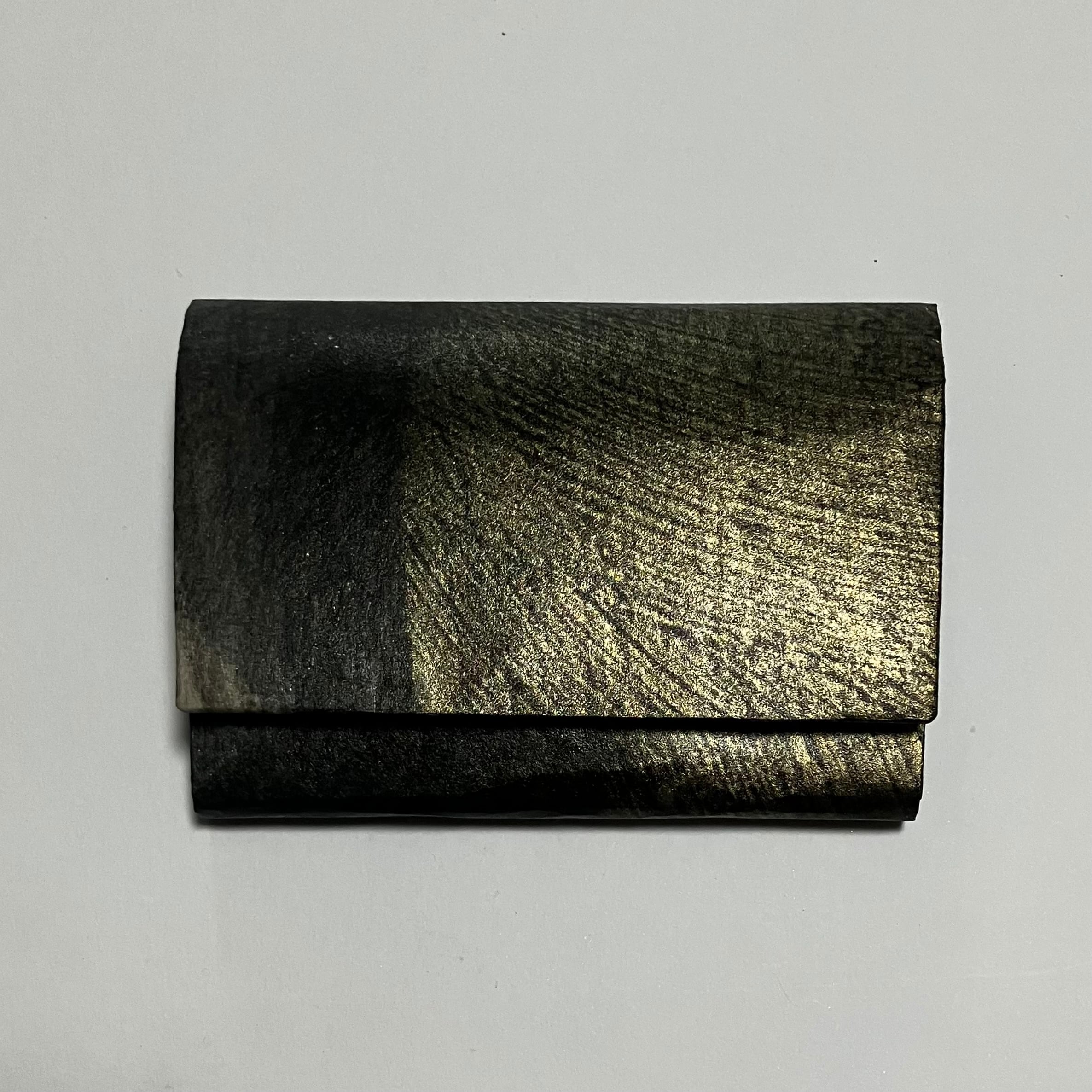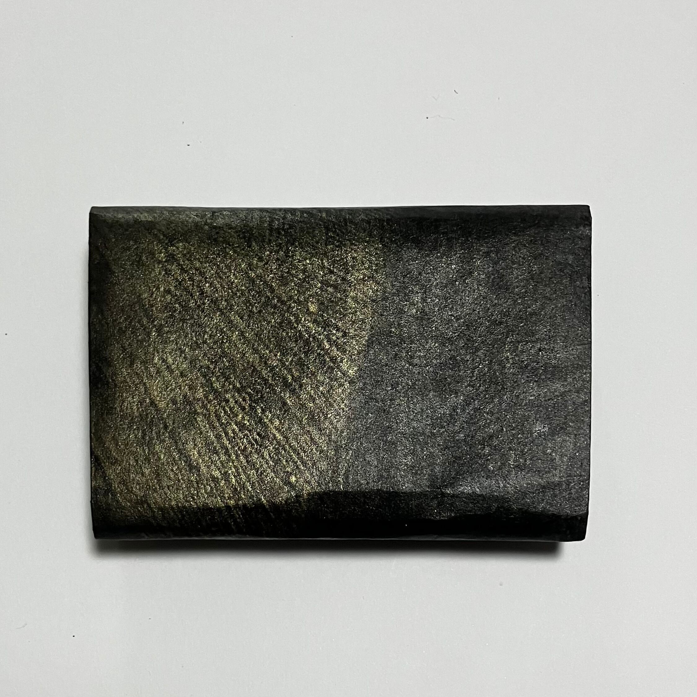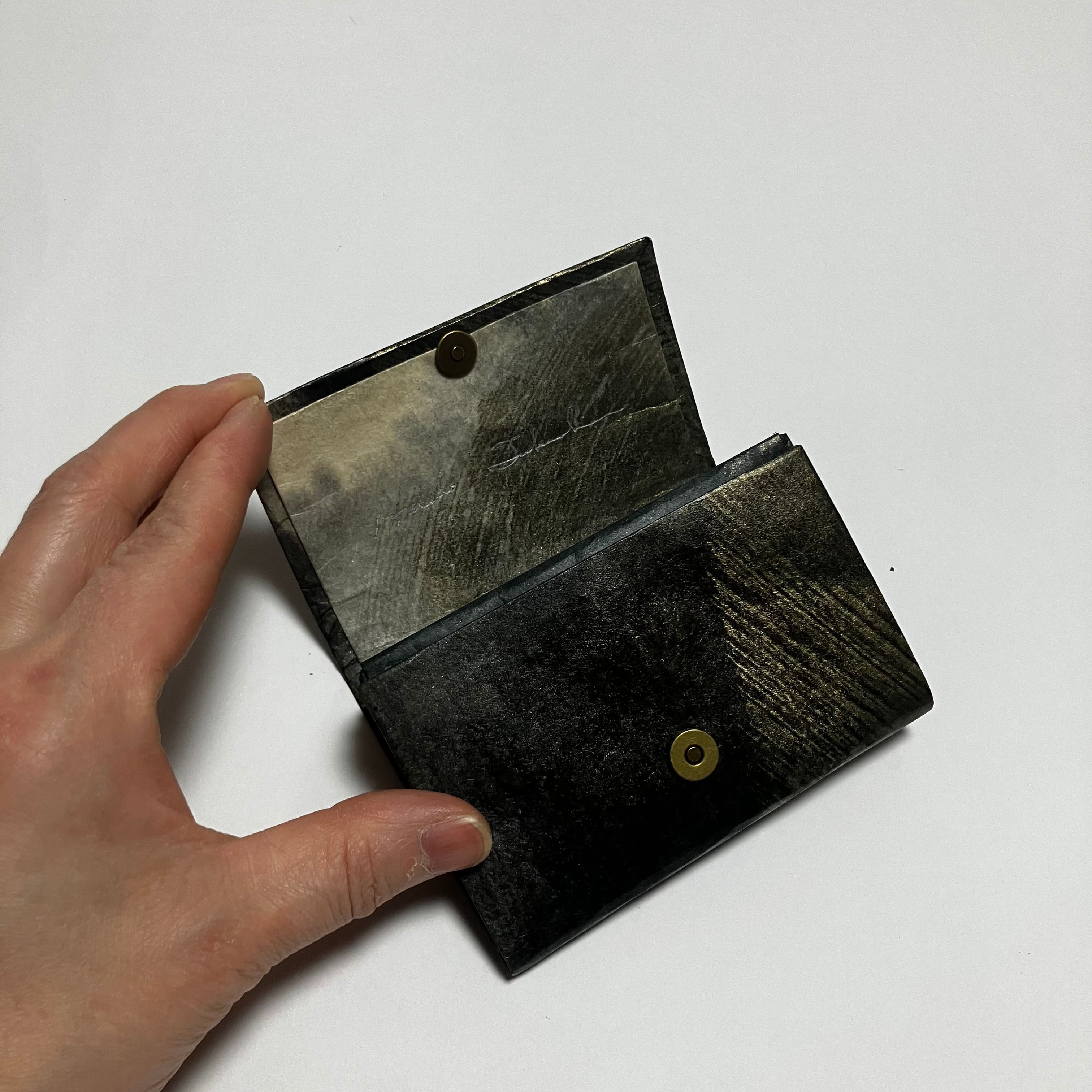 黒曜と名付けたこの名刺入れは黒色、茶色が和紙のアイボリー色の紙面にランダムに広がっています。茶色には金彩も含ませたので、部分的に光沢もあります。モダンアートのような表情に仕上がったこの名刺入れ。どんな方に使って頂けるかとても楽しみです。見た目のハードな印象とは違って、手に持つと和紙のあたたかさが指先から伝わってきます。