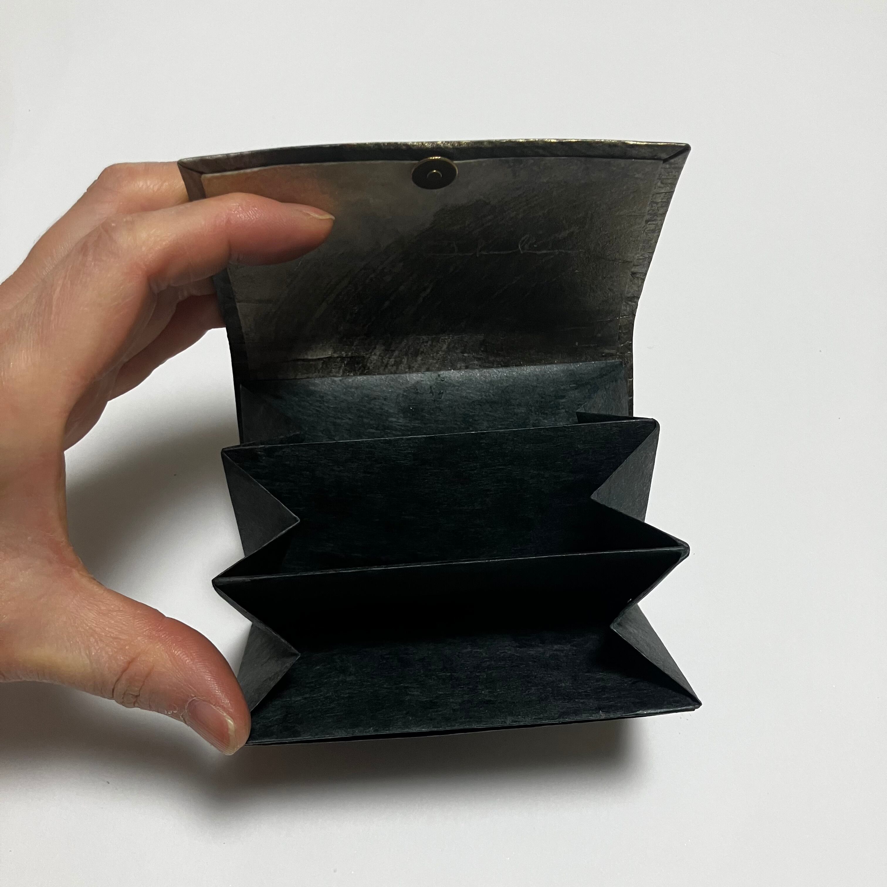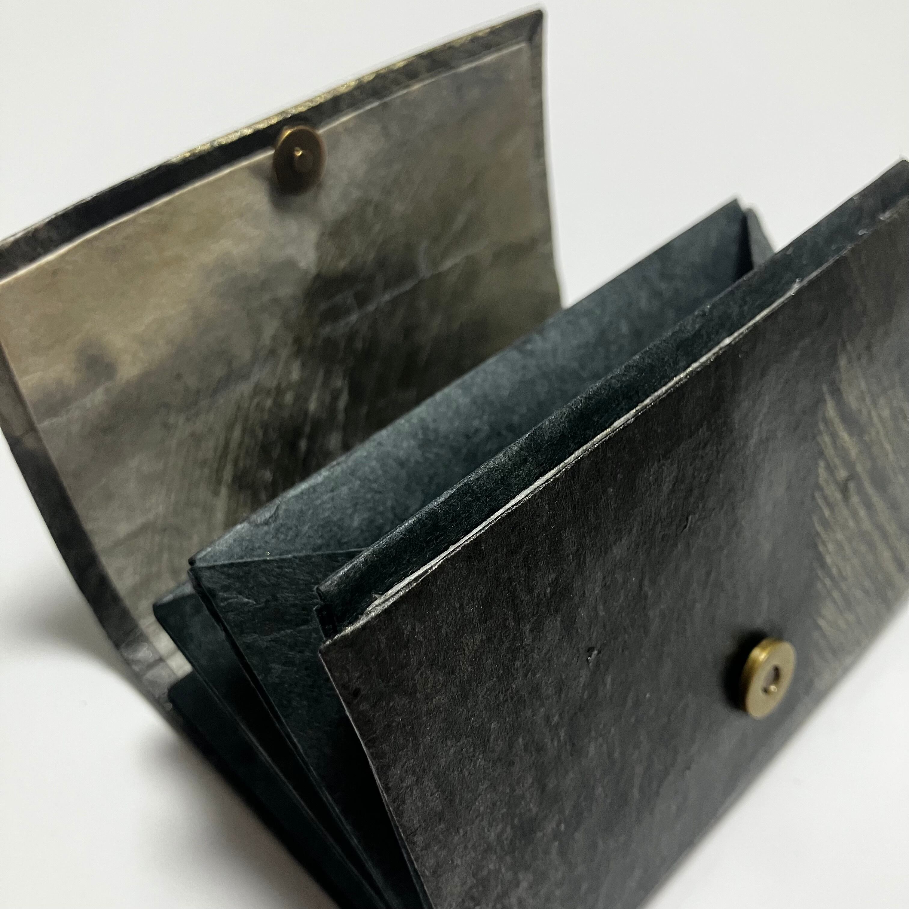3つポケット。マグネットボタン <サイズ> 約 高さ7.5cm×幅10.5cm×厚み1.5cm <重さ>18g ポケットに使用した同じ色の三椏紙の和紙袋、「作品のお取り扱いについて」説明書付き