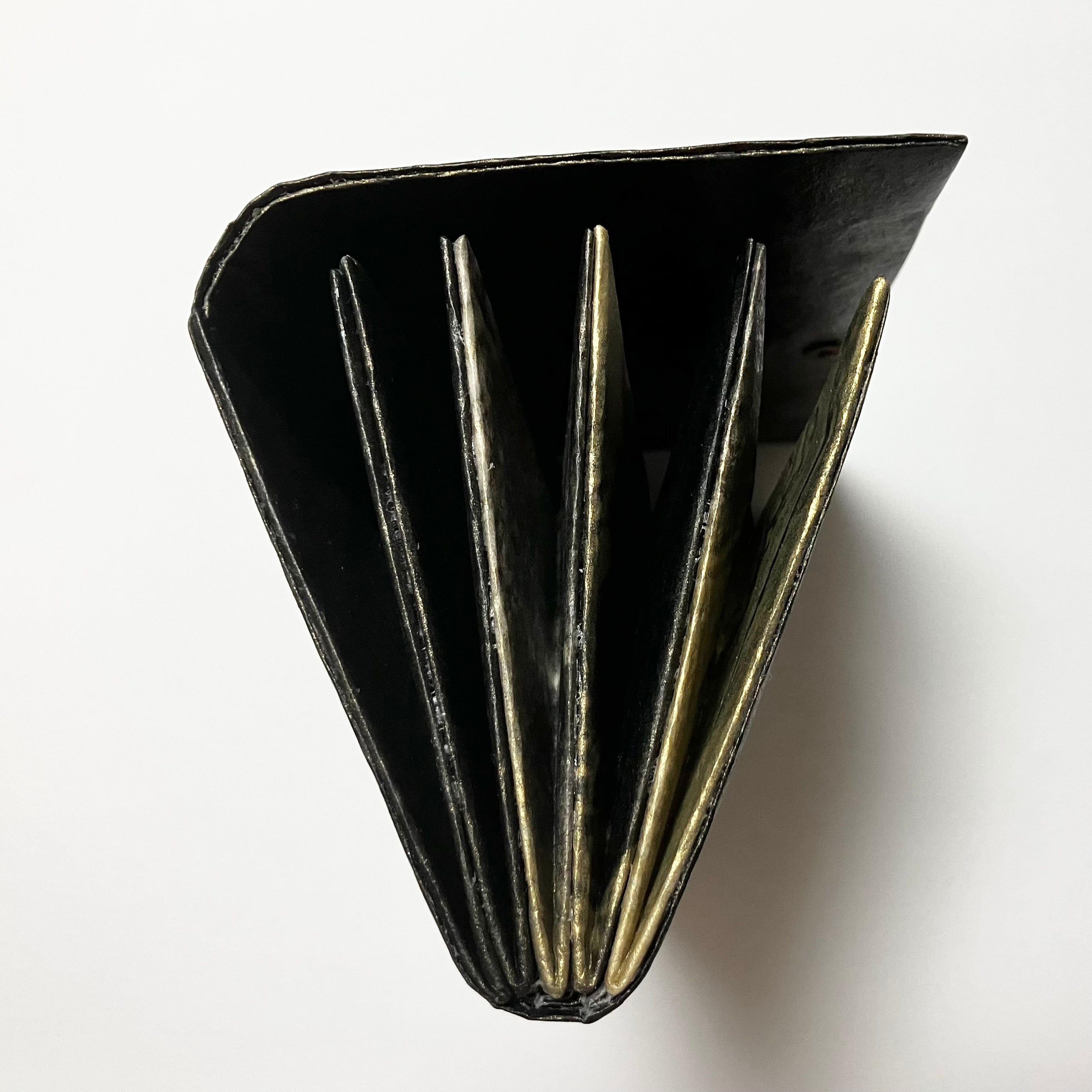 黒曜と名付けたこの長財布は黒色をベースに金色が部分的に広がっています。和紙そのままの白地もポケットを開いた時に少し見えますが、全体的に漆黒のイメージです。お客様のご要望でポケットを5つにしました。ポケットに入れたいモノをお聞きして、少し深いポケットにしました。見た目のハードな印象とは違って、手に持つと和紙のあたたかさが指先から伝わってきます。仕上げに撥水効果のあるパールトーン加工をしています。