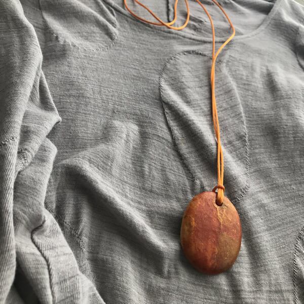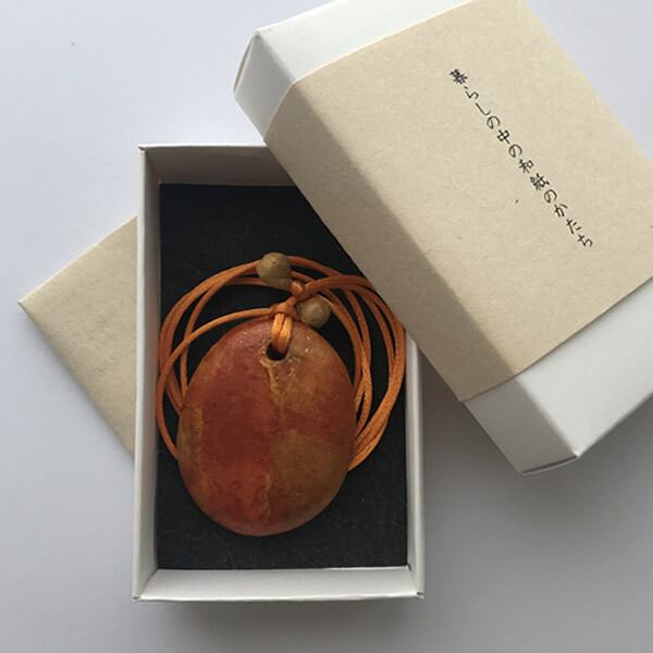 朝焼(あさやけ)と名付けたこのペンダントは朱色、橙色、黄色、茶色など。太陽から感じられる色で作りました。ベースは軽量紙粘土です。その上に色染めした和紙を貼り重ねています。楮の繊維が自然の質感を感じさせてくれます。鮮やかな陽の色は見ているだけで元気になります。最後に金彩を加えて仕上げました。同系色の紐はフランス製レーヨンで光沢があり、身に着けていてもなじみやすいです。赤系に合わせたり。白や黒のお洋服にアクセントとしても活躍できそうです。金属を使用していないので、金属アレルギーの方でもお使い頂けます。和紙は埼玉県の小川和紙を使用しています。紐は両端の丸い部分を引っ張ると長さが調節できます。