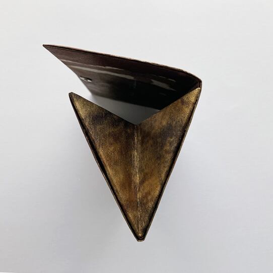 渋いこげ茶色に夕焼けに照らされた海の金色のような色合いが広がるお財布です。華やかでゴージャス。金色をふんだんに使って染めました。いぶされたような金古美色は落ち着きのある上品さで手元を明るく演出してくれます。