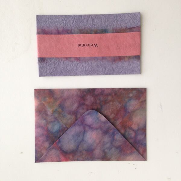 名刺サイズの封筒付和紙のウェルカムカードです。強製紙を貼り重ね、模様紙を帯にして、島根県、出雲民藝紙を漉く三椏紙にメッセージを入れて仕上げました。封筒も模様紙です。カードサイズ 幅9cm×高5.5cm 封筒サイズ 幅10cm×高さ7cm