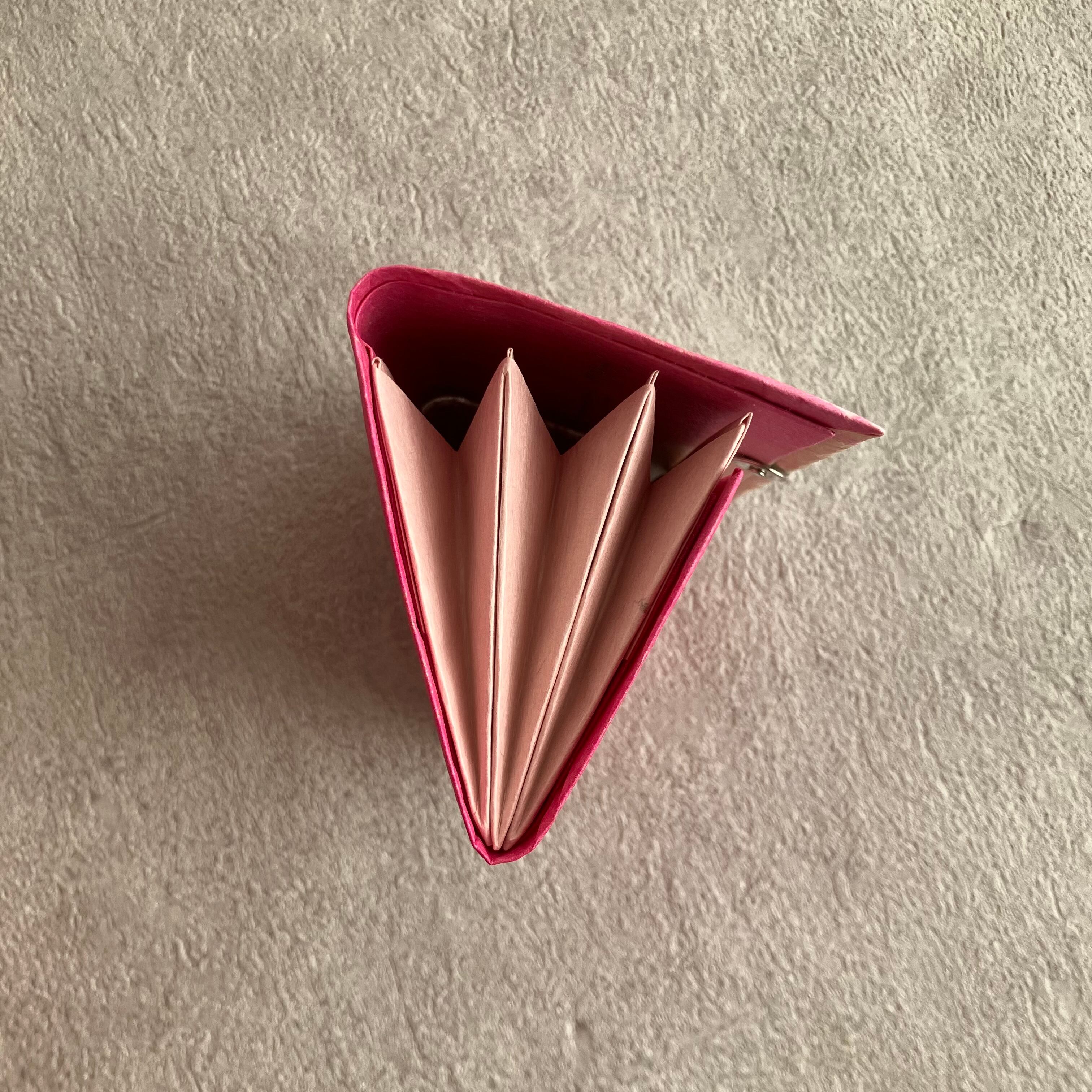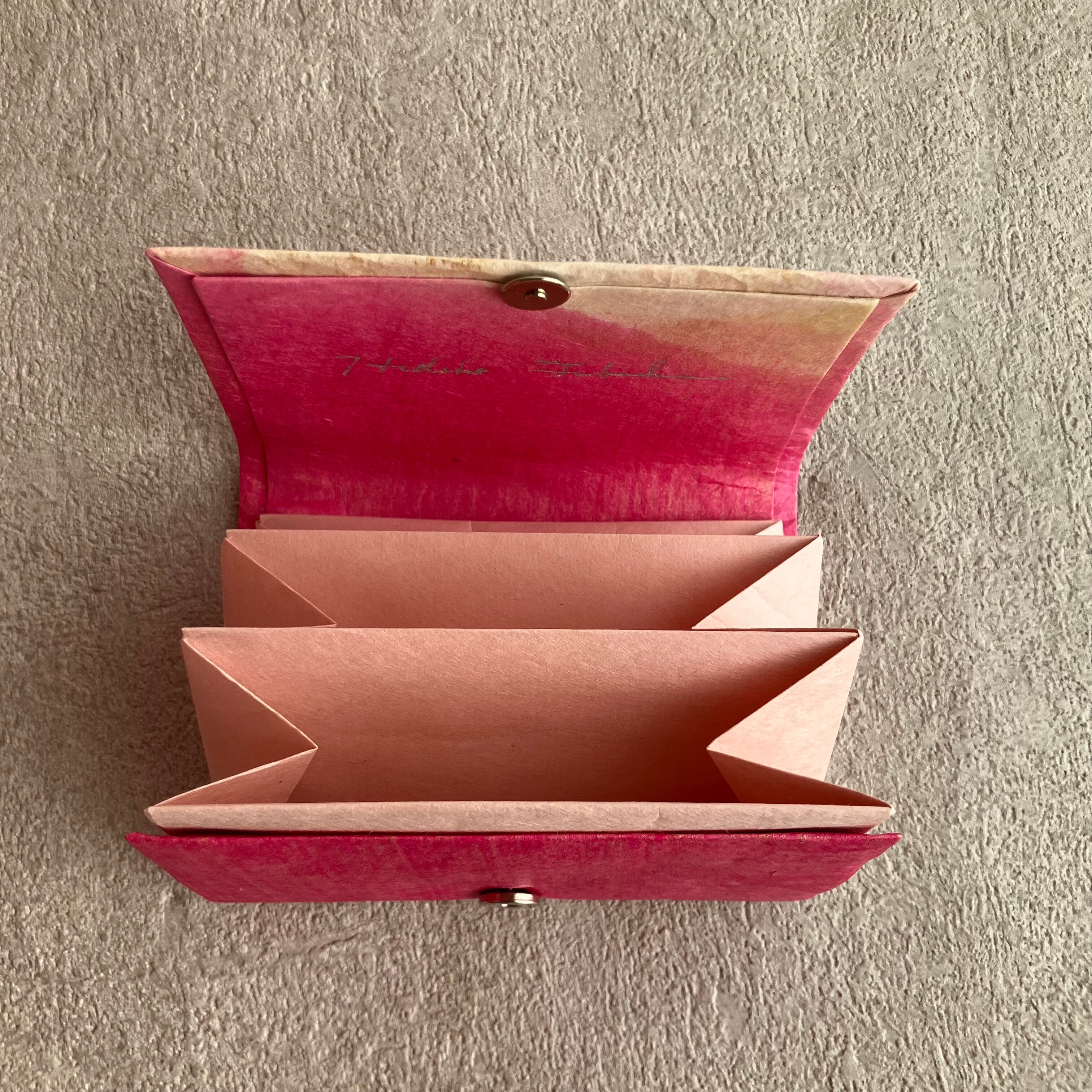 3つポケット。マグネットボタン <サイズ> 約 高さ7.5cm×幅10.5cm×厚み1.5cm <重さ>18g ポケットに使用した同じ色の三椏紙の和紙袋、「作品のお取り扱いについて」説明書付き