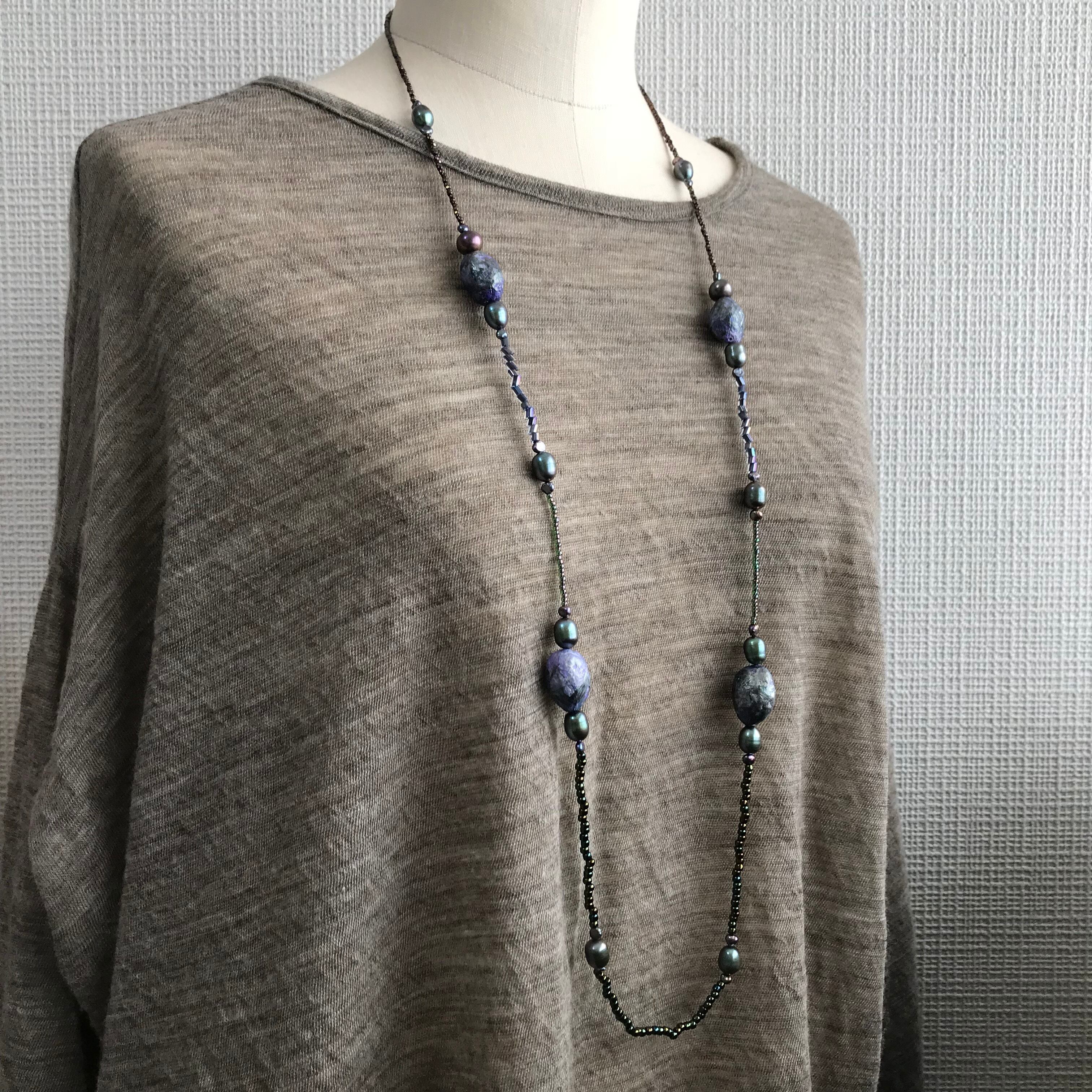 和紙を貼り重ねたパーツにバロック風の淡水パールとビーズを合わせて仕上げました。作品タイトルは「勾玉」まがたま。ムール貝と翡翠の色合いを掛け合わせたイメージで作りました。美しい貝殻にも趣のある天然石にも惹かれます。和紙は人がつくるものですが、自然素材を丁寧に処理することで、自然がつくる造形に少し近づくのでは。そんな思いで作ったネックレスです。